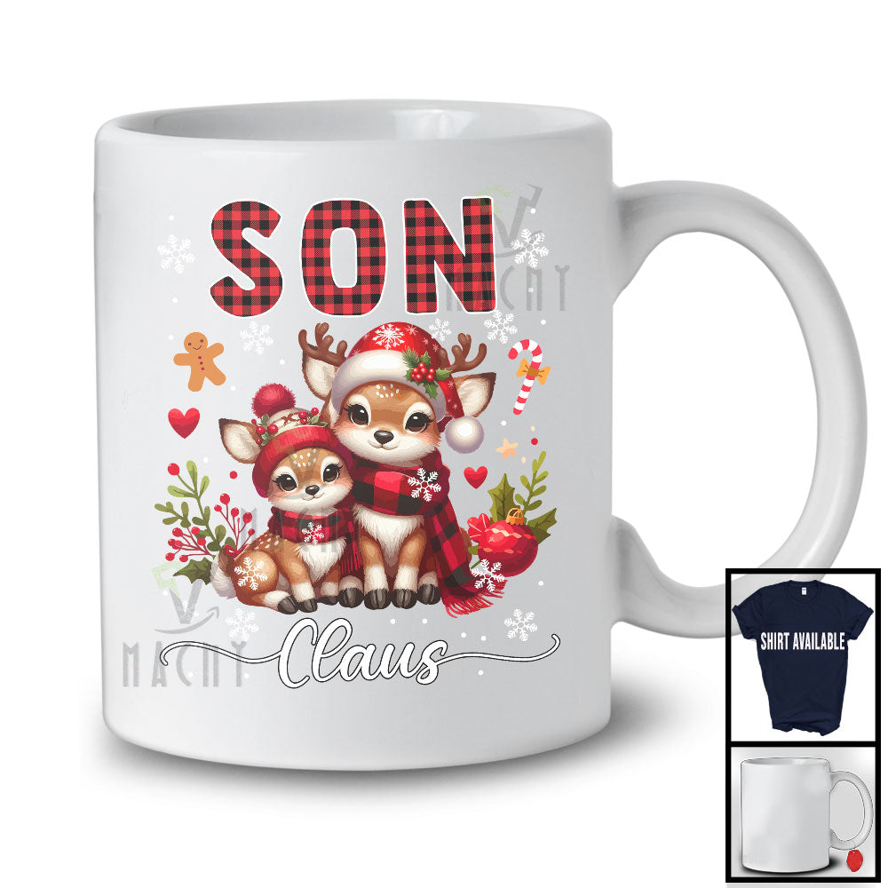 • Son Claus; Lovely Christmas Red Plaid Reindeer Lover; X-mas Snowing Family Group T-Shirt. This cotton t-shirt is a durable staple product with a classic fit. One of the most popular items, it has a relaxed style made for everyday and casual wear.
