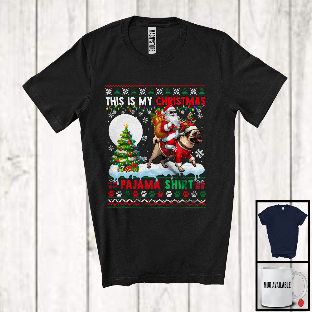 This Is My Christmas Pajama Shirt; Joyful Santa Riding Reindeer Pug Puppy; X-mas Sweater T-Shirt