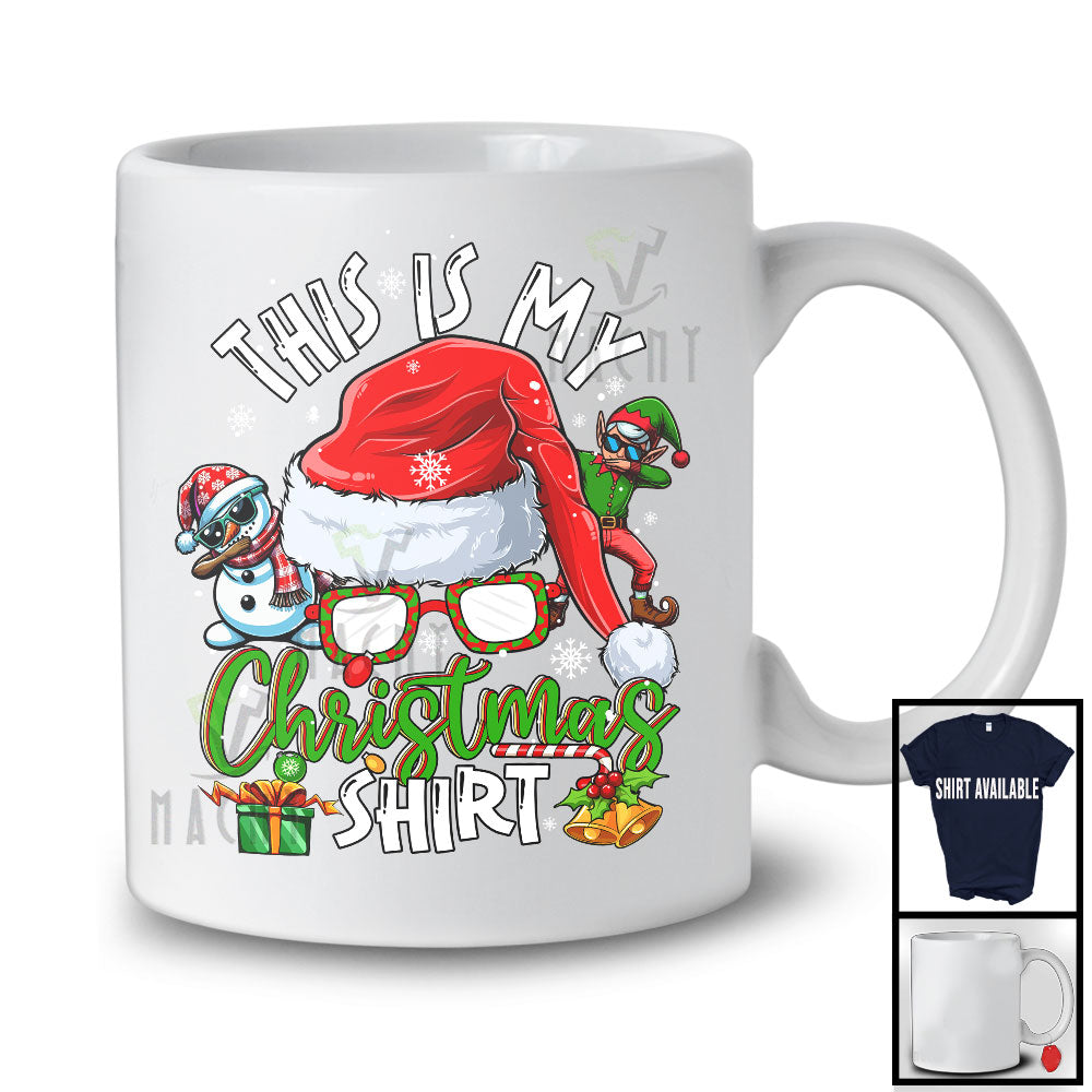 • This Is My Christmas Shirt, Joyful X-mas Santa Sunglasses Face, Dabbing ELF Snowman Group T-Shirt. This cotton t-shirt is a durable staple product with a classic fit. One of the most popular items, it has a relaxed style made for everyday and casual wear.