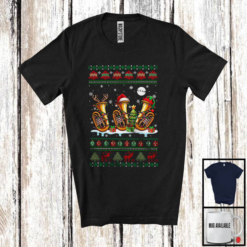 Three Santa Elf Reindeer Tuba; Cheerful Christmas Tree Sweater Snow; Musical Instruments Player T-Shirt
