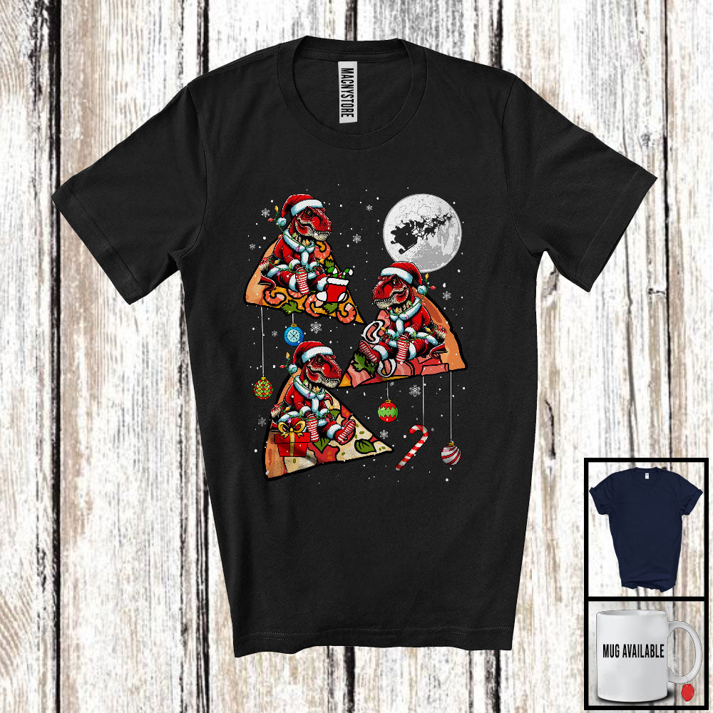 Three Santa T-Rex Riding Pizza; Humorous Christmas Pizza Food Galaxy; Family Group T-Shirt
