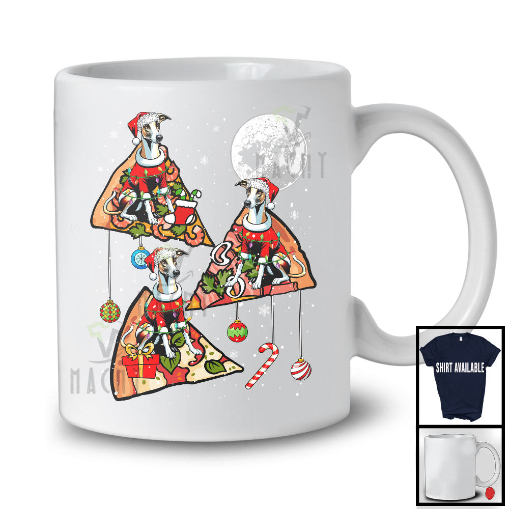 Three Santa Whippet Riding Pizza; Humorous Christmas Pizza Food Galaxy; Family Group T-Shirt. This cotton t-shirt is a durable staple product with a classic fit. One of the most popular items, it has a relaxed style made for everyday and casual wear.