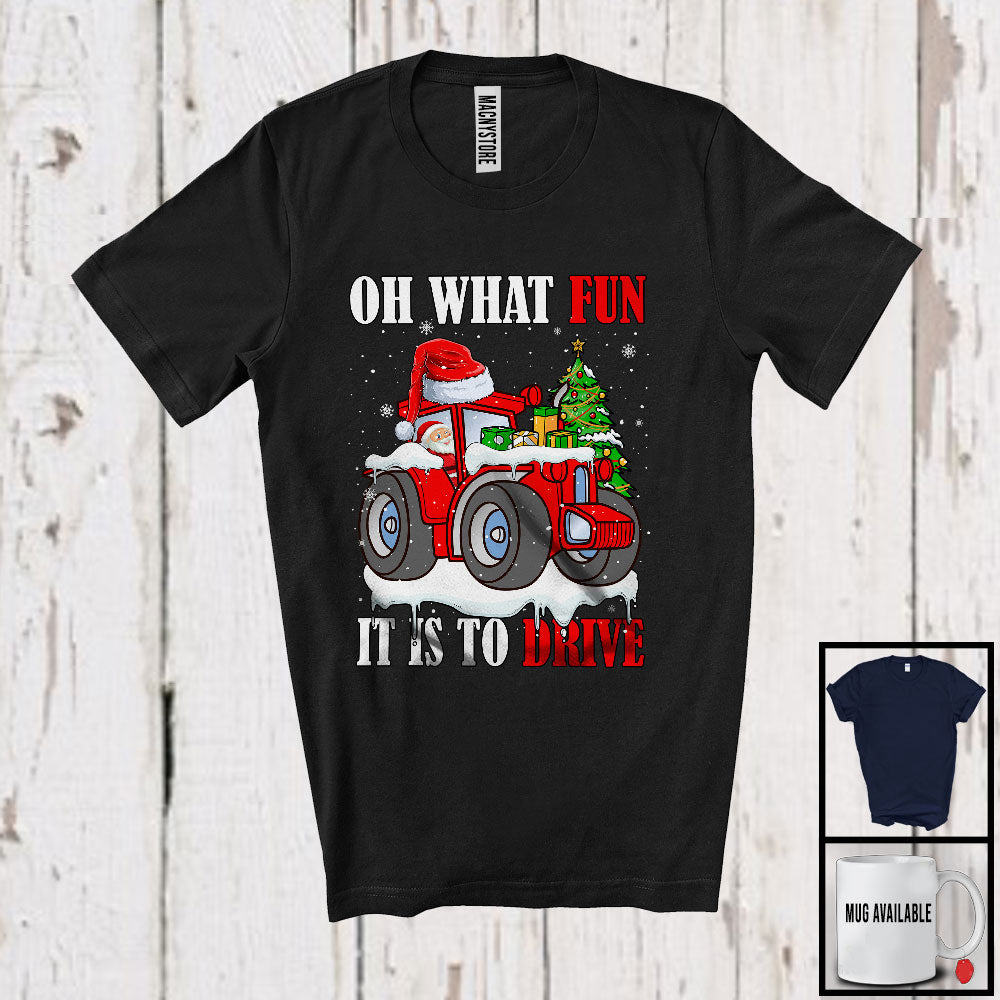 • What Fun To Drive; Joyful Christmas Moon Santa Tractor Driver; X-mas Family Group T-Shirt. This cotton t-shirt is a durable staple product with a classic fit. One of the most popular items, it has a relaxed style made for everyday and casual wear.