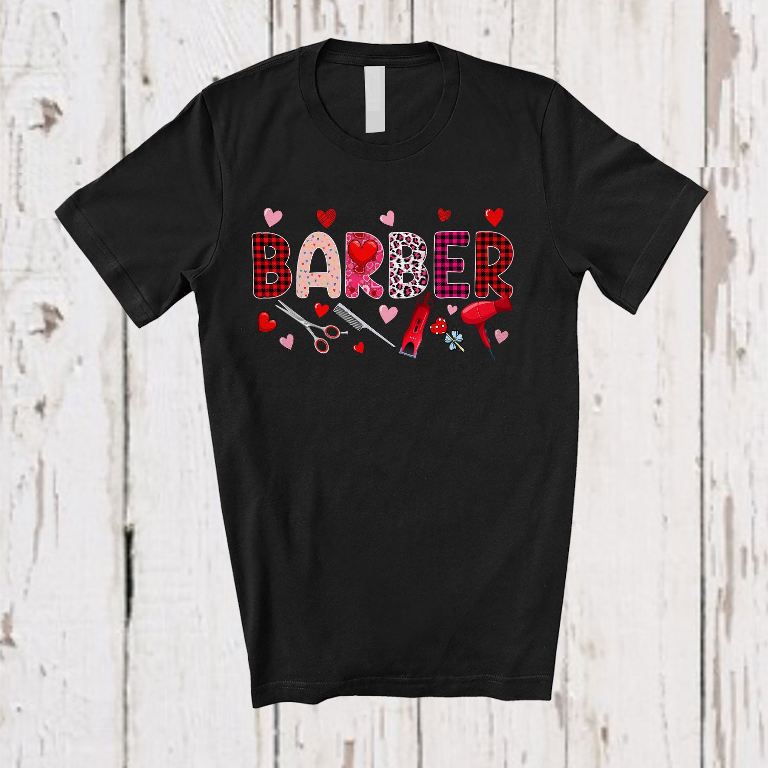 Barber; Lovely Valentine's Day Leopard Plaid Hearts Scissors; Proud Jobs Careers Family Group T-Shirt. This cotton t-shirt is a durable staple product with a classic fit. One of the most popular items, it has a relaxed style made for everyday and casual wear.