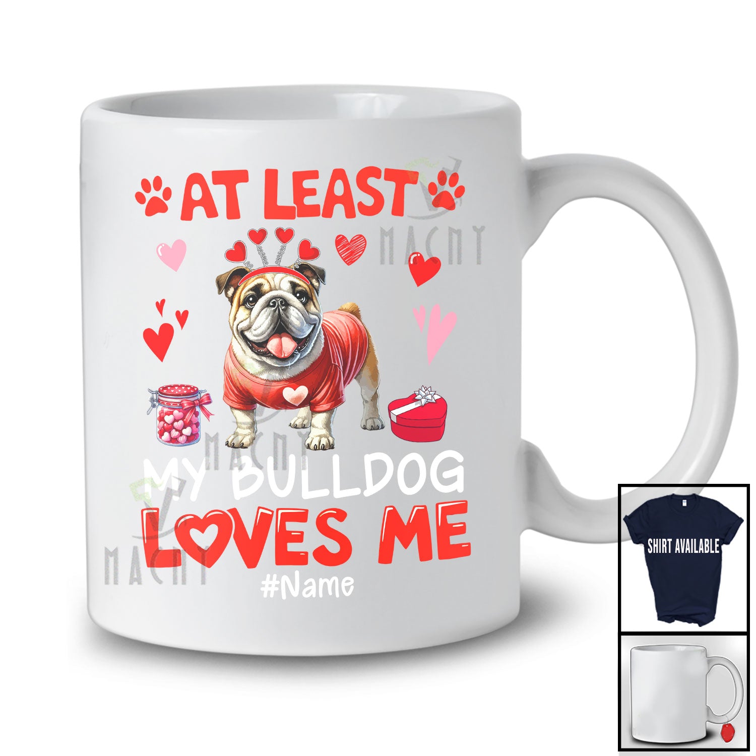 • Personalized At Least My Bulldog Loves Me; Lovely Valentine Hearts; Custom Name Single Family T-Shirt. This cotton t-shirt is a durable staple product with a classic fit. One of the most popular items, it has a relaxed style made for everyday and casual wear.
