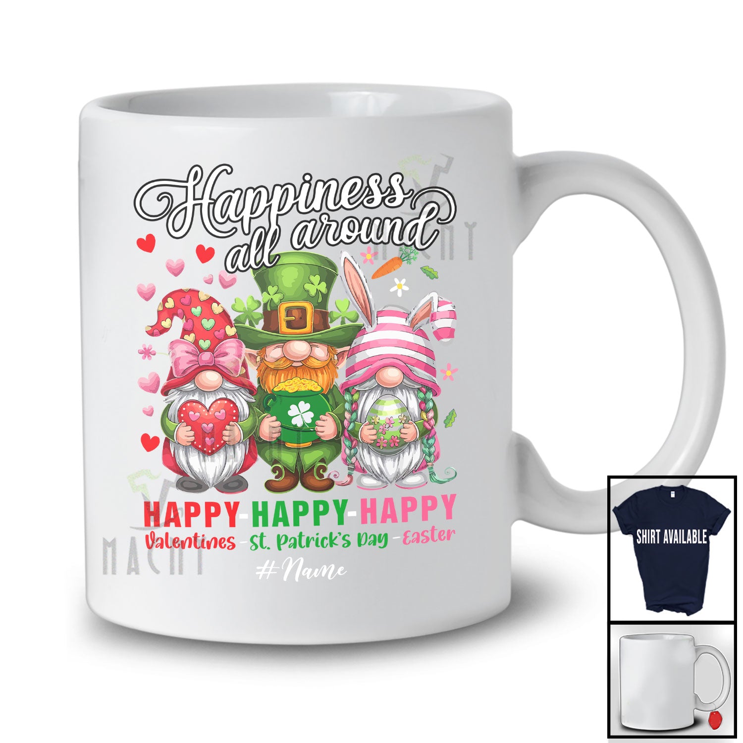 This Personalized Custom Name Happiness All Around; Happy Valentine St. Patrick's Day Easter 3 Gnomes T-Shirt is great idea gift for your family, friends in this birthday, christmas, mother's day, father's day, patrick's day or any holiday.
