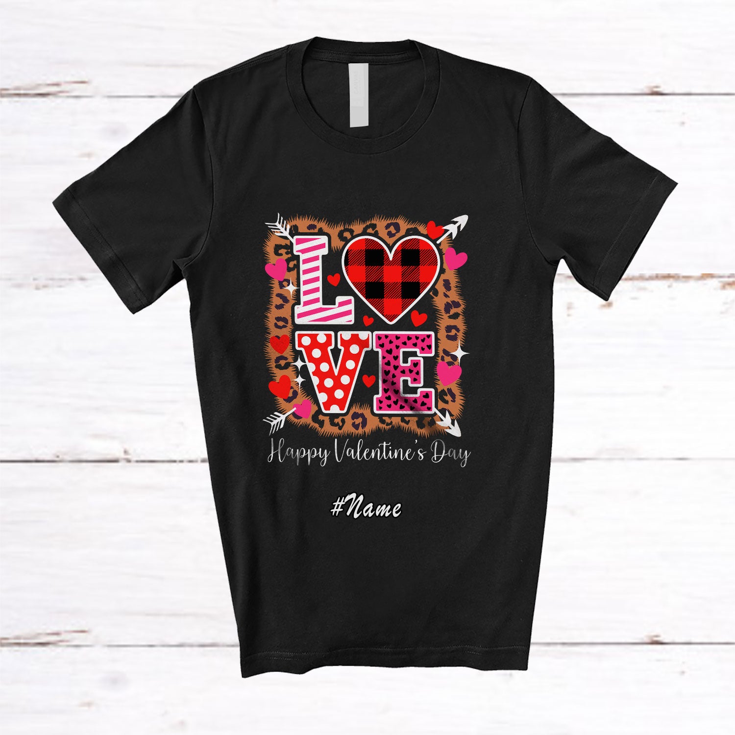 Personalized Custom Name LOVE Happy Valentine's Day; Lovely Leopard Plaid Heart; Couple Family T-Shirt