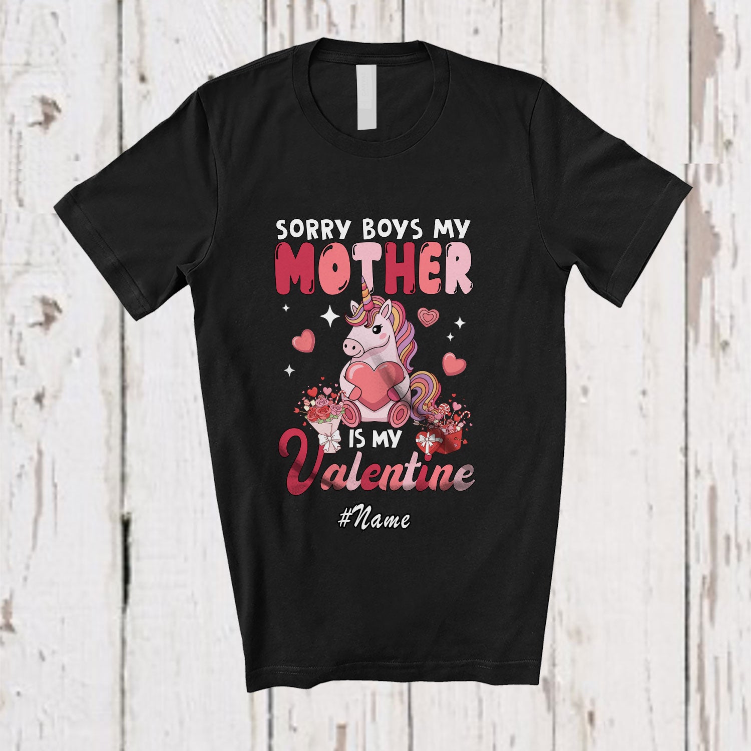 Personalized Custom Name Sorry My Mother Is My Valentine; Lovely Unicorn Hearts; Girls Family T-Shirt. This cotton t-shirt is a durable staple product with a classic fit. One of the most popular items, it has a relaxed style made for everyday and casual wear.