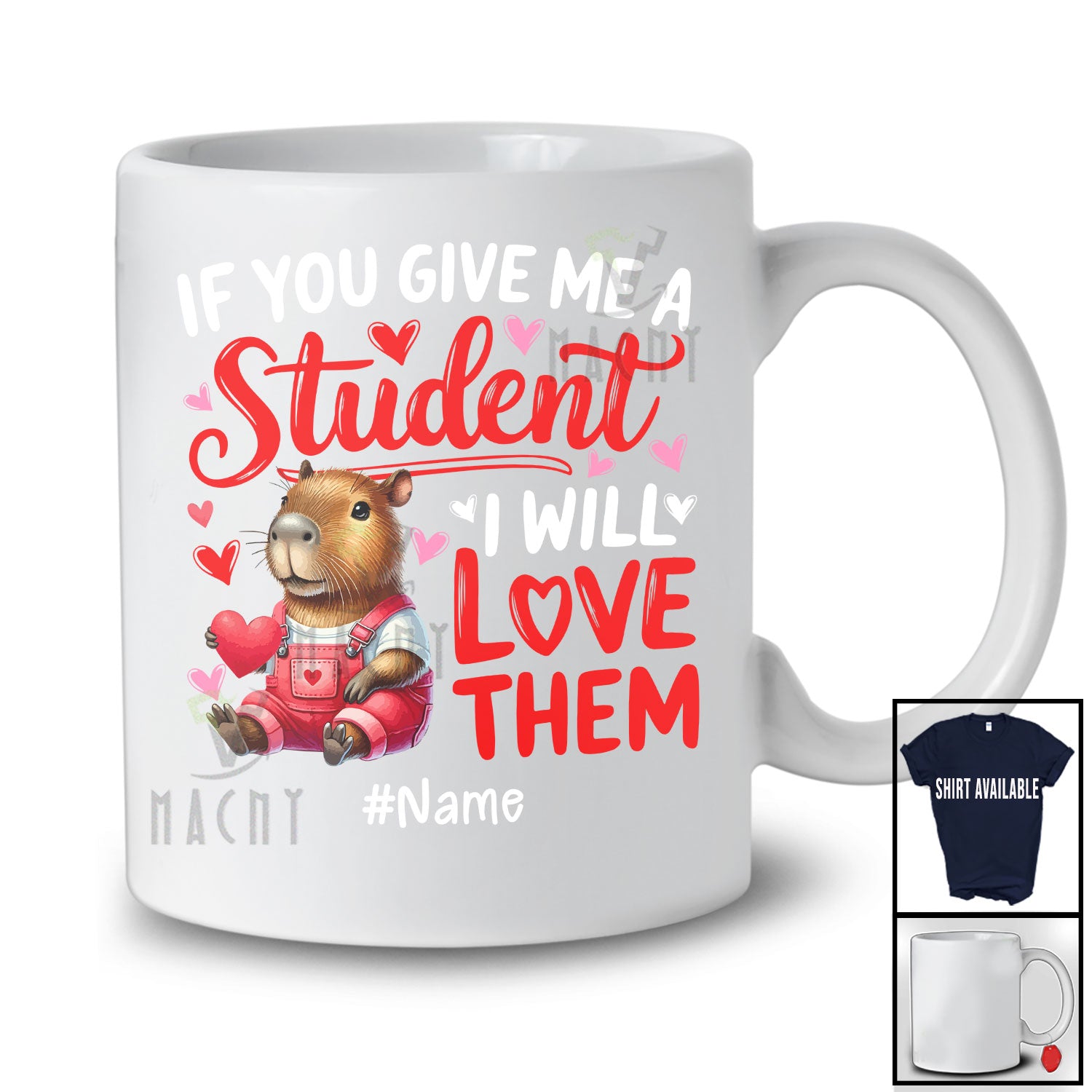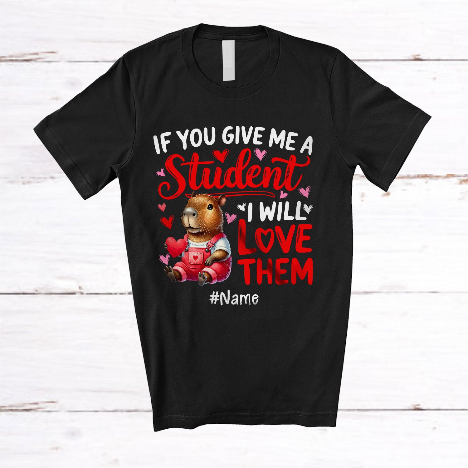 Every product is unique, just like you. If you're looking for a product that fits the mold of your life, the Personalized Give Me A Student I Will Love Them; Lovely Valentine Capybara; Custom Name Teacher T-Shirt is for you.