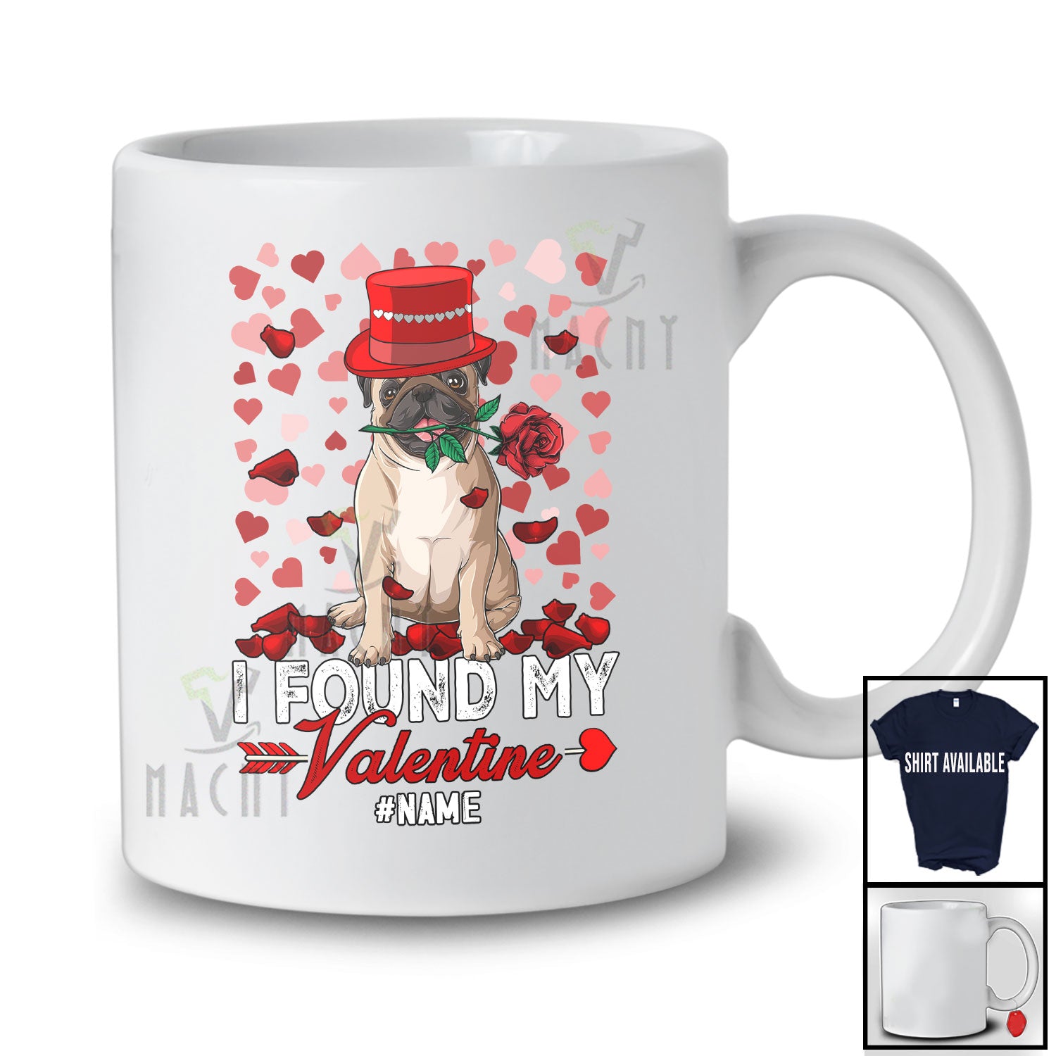 Personalized I Found My Valentine; Lovely Pug Holding Rose Hearts; Custom Name Couple T-Shirt. This cotton t-shirt is a durable staple product with a classic fit. One of the most popular items, it has a relaxed style made for everyday and casual wear.