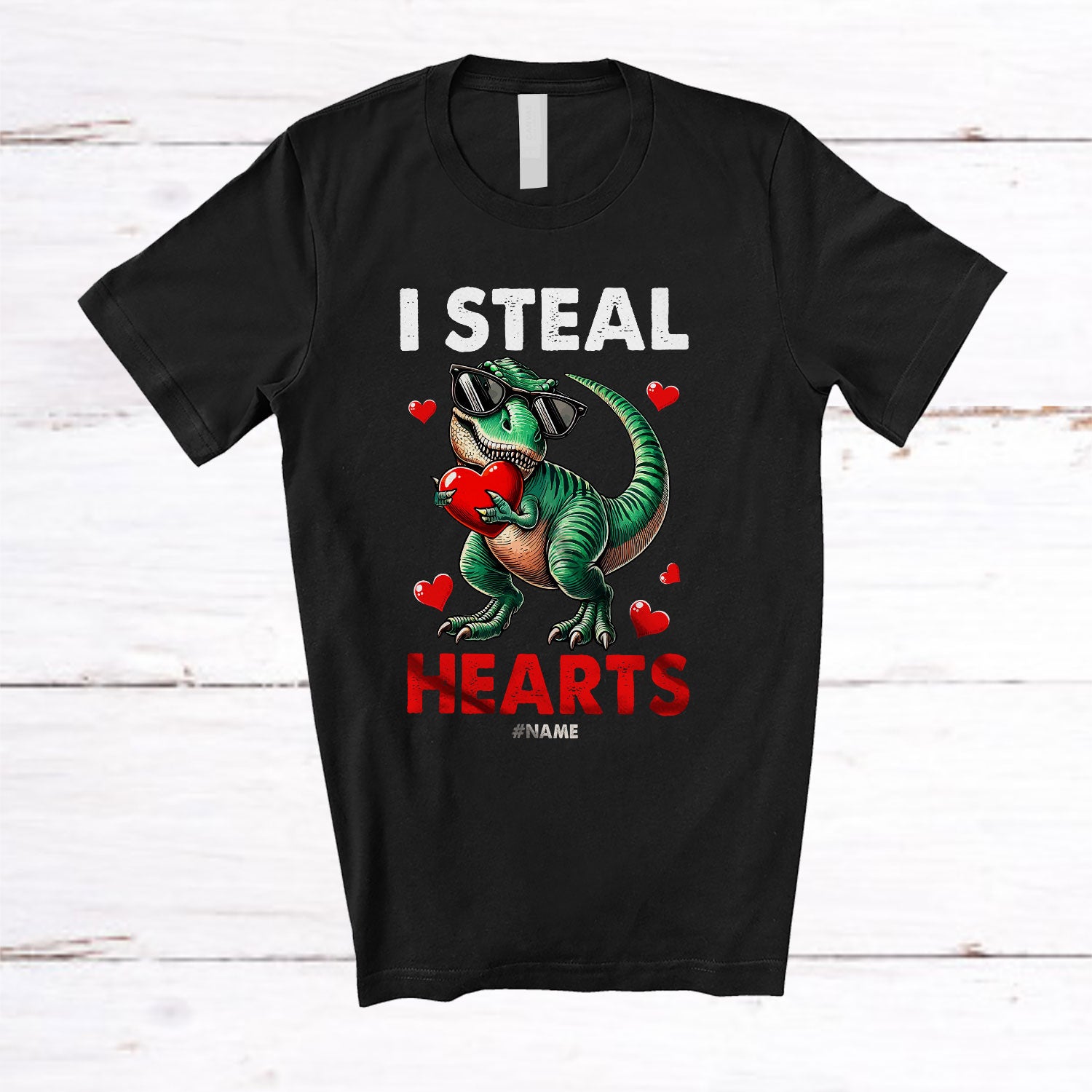 Personalized I Steal Hearts; Adorable Valentine T-Rex Holding Hearts; Custom Name Men Single T-Shirt