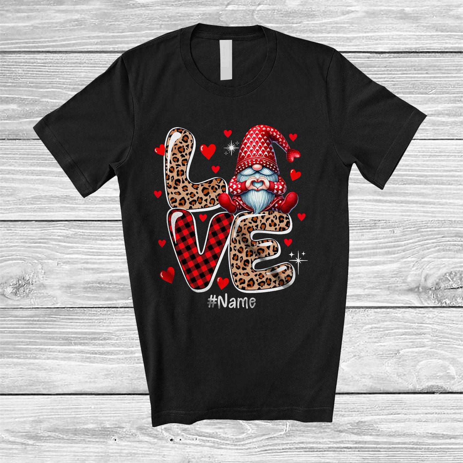 Personalized LOVE; Adorable Valentine's Day Custom Name Gnome; Leopard Plaid Hearts T-Shirt