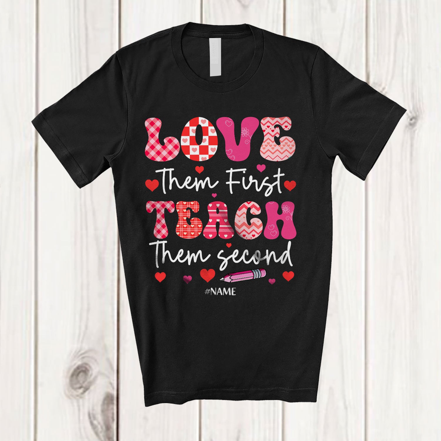Personalized LOVE Them First Teach Second; Amazing Valentine Plaid Hearts; Custom Name Teacher T-Shirt