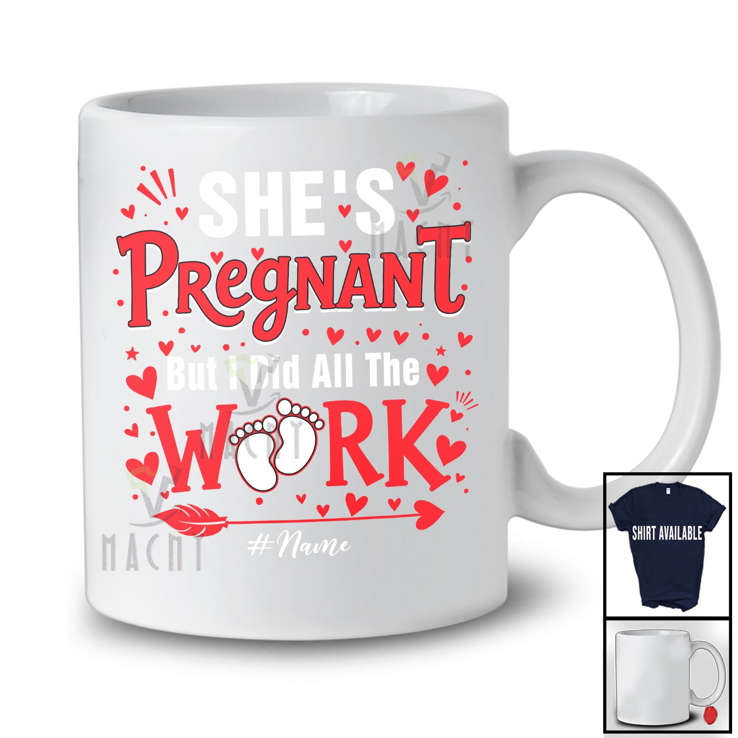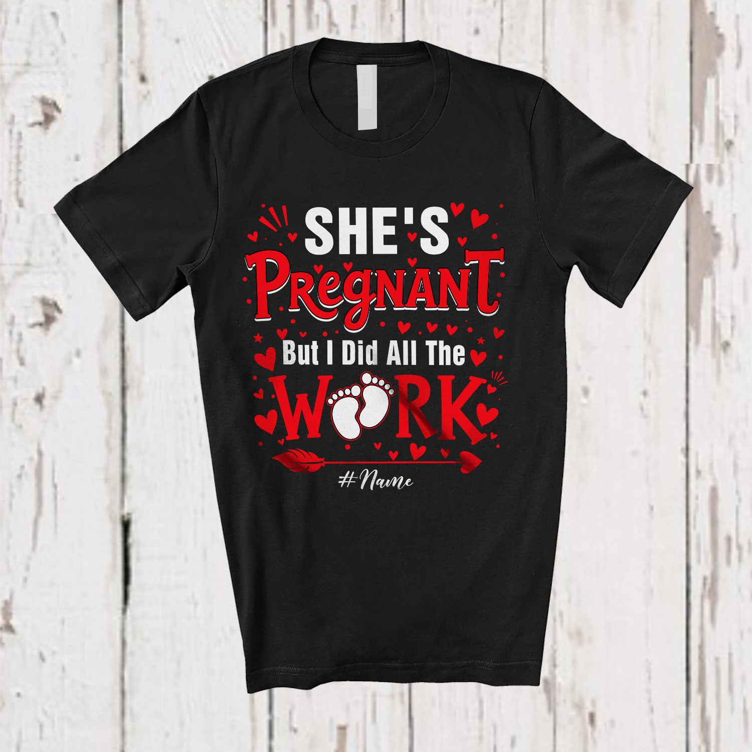 • Personalized She's Pregnant I Did All The Work; Happy Valentine Pregnancy; Custom Name Couple T-Shirt. This cotton t-shirt is a durable staple product with a classic fit. One of the most popular items, it has a relaxed style made for everyday and casual wear.