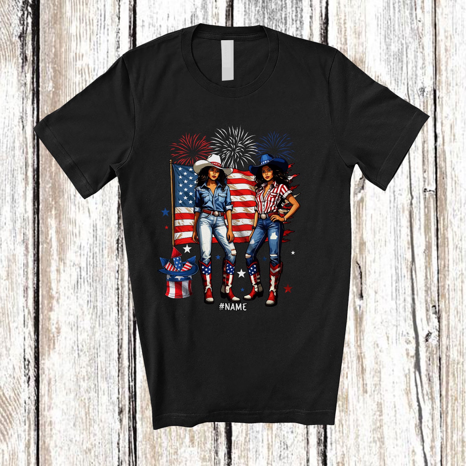 Personalized Custom Name Cowgirl With American Flag; Humorous 4th of July Women Patriotic T-Shirt