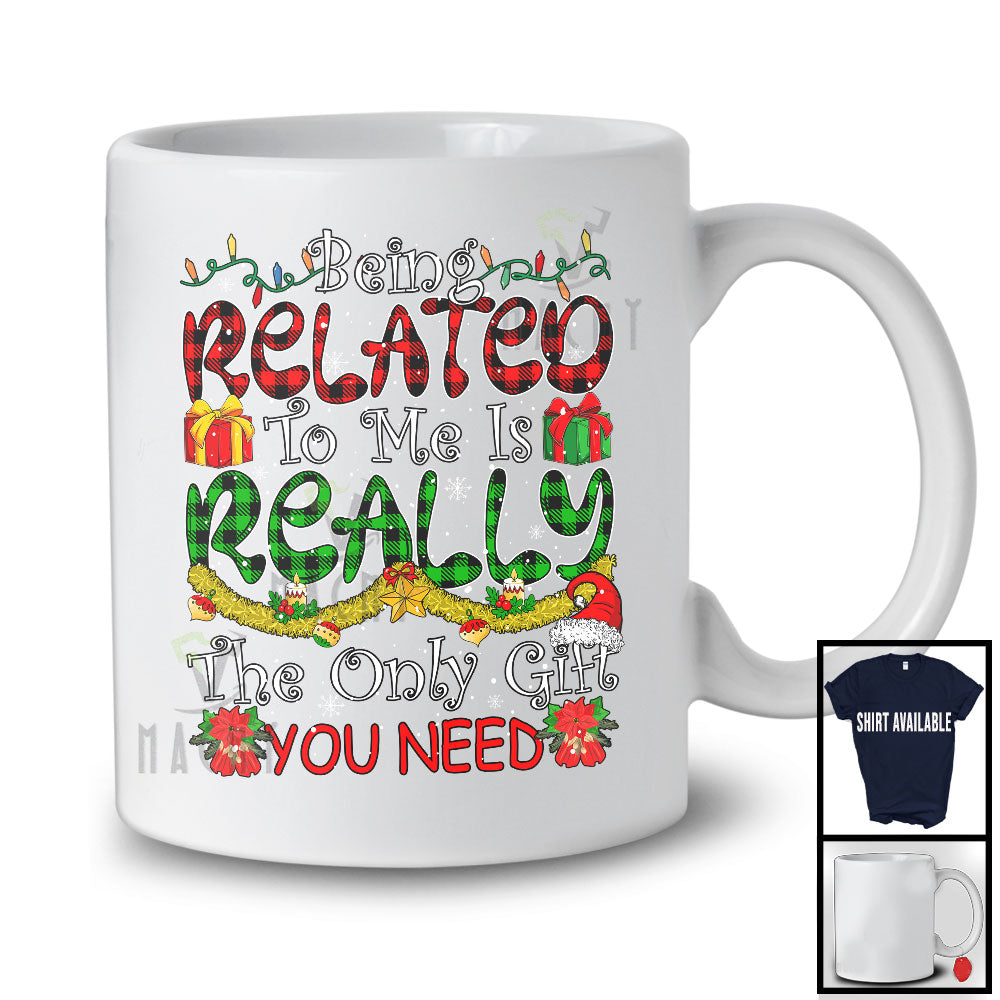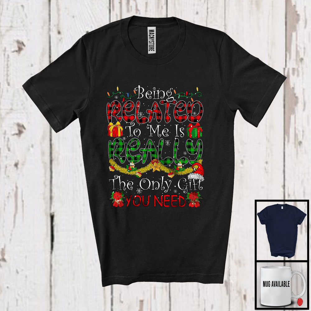 Being Related To Me; Awesome Christmas Lights Plaid Ornaments; Family Friend X-mas Group T-Shirt. This cotton t-shirt is a durable staple product with a classic fit. One of the most popular items, it has a relaxed style made for everyday and casual wear.