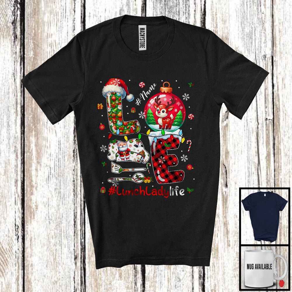 Personalized Custom Name LOVE Lunch Lady; Lovely Christmas Plaid Ornament Cooking Tools T-Shirt. This cotton t-shirt is a durable staple product with a classic fit. One of the most popular items, it has a relaxed style made for everyday and casual wear.