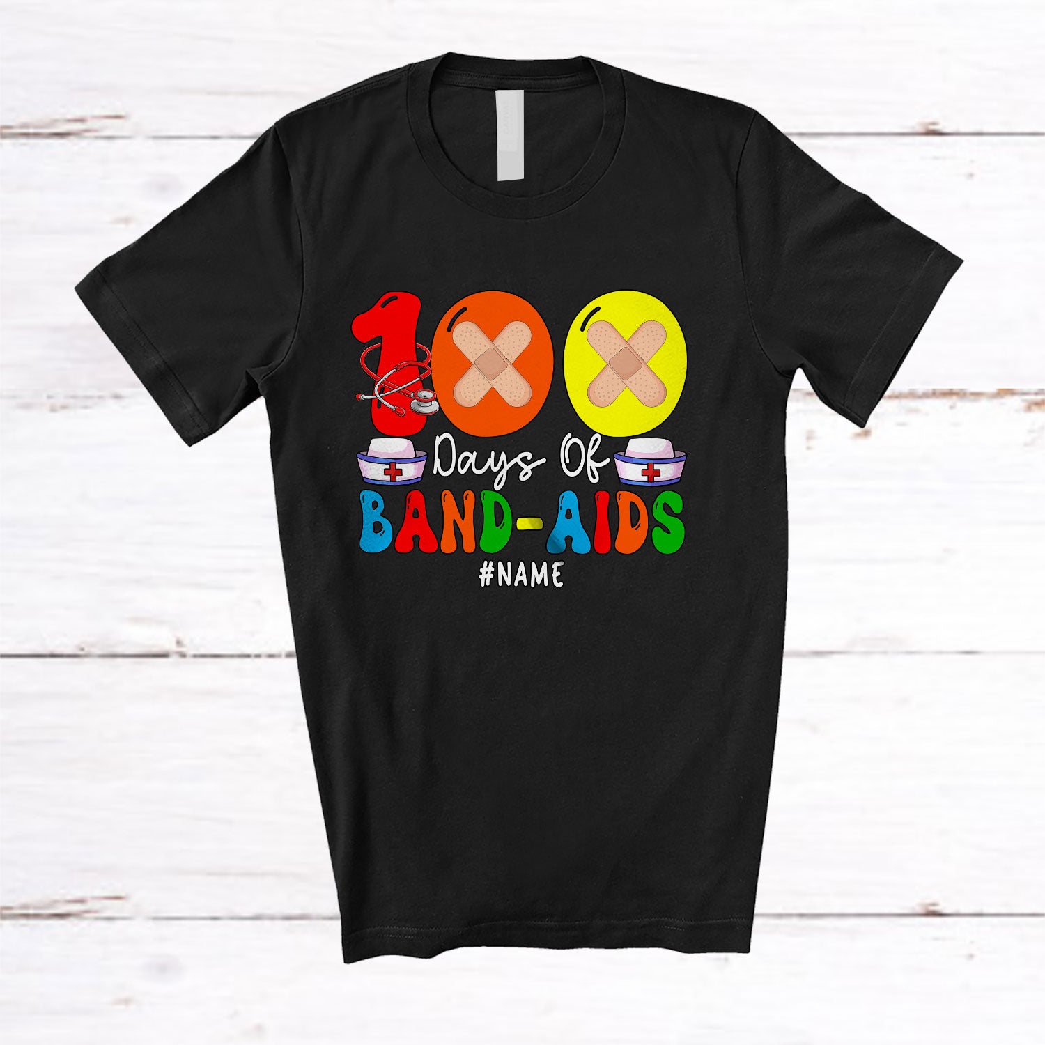 Personalized 100 Day Of Band-aids; Joyful 100th Day Of School Custom Name Nurse; Nursing T-Shirt. This cotton t-shirt is a durable staple product with a classic fit. One of the most popular items, it has a relaxed style made for everyday and casual wear.