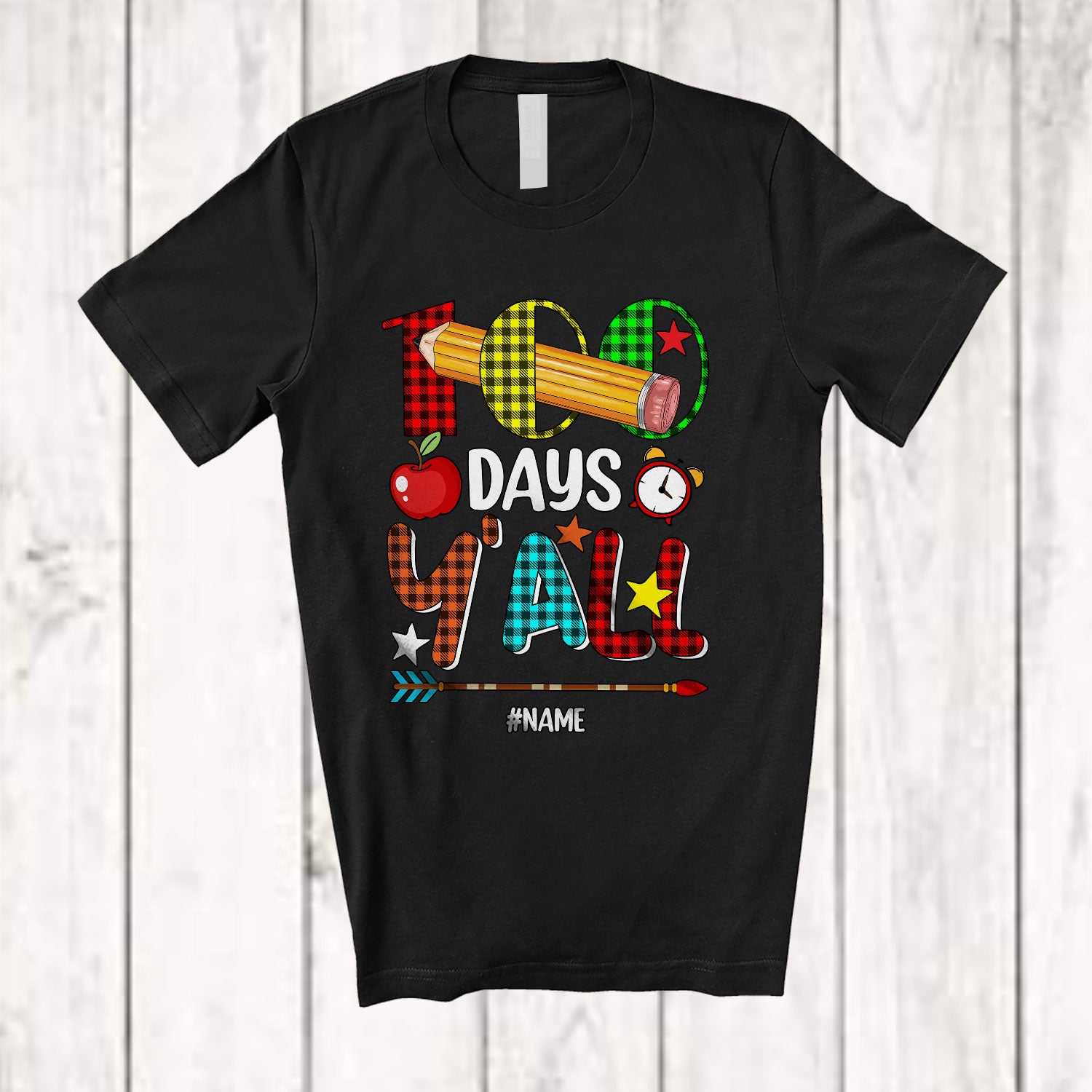 Personalized 100 Days Y'all; Amazing 100th Day Of School Plaid; Custom Name Teacher Students T-Shirt. This cotton t-shirt is a durable staple product with a classic fit. One of the most popular items, it has a relaxed style made for everyday and casual wear.
