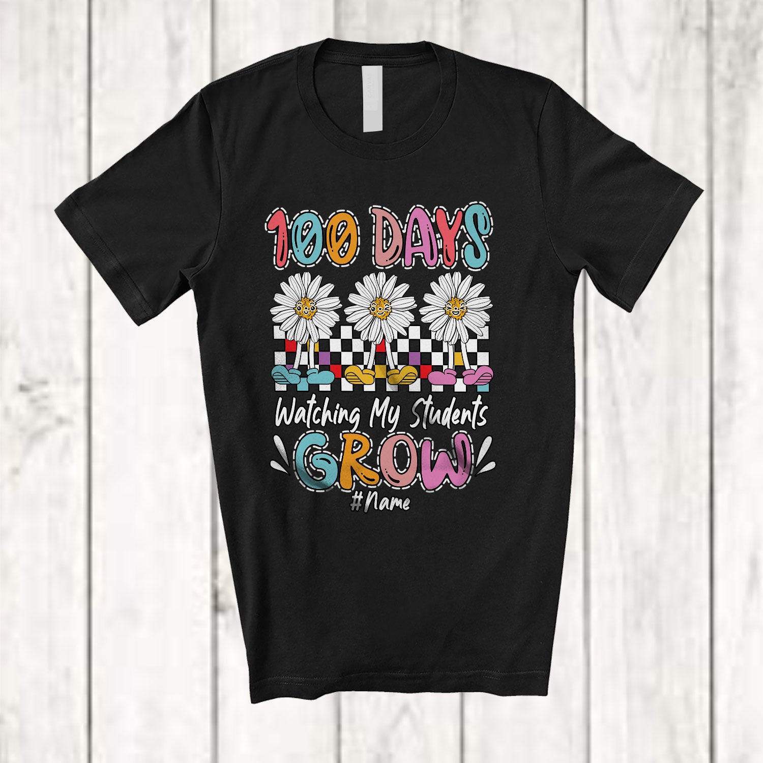 Personalized Custom Name 100 Days Watching My Students Grow; Lovely School Three Daisy T-Shirt. This cotton t-shirt is a durable staple product with a classic fit. One of the most popular items, it has a relaxed style made for everyday and casual wear.