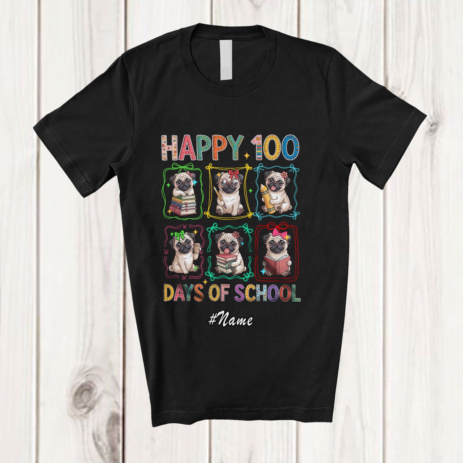 Personalized Custom Name Happy 100 Days Of School; Lovely Pug Reading Books Studying T-Shirt
