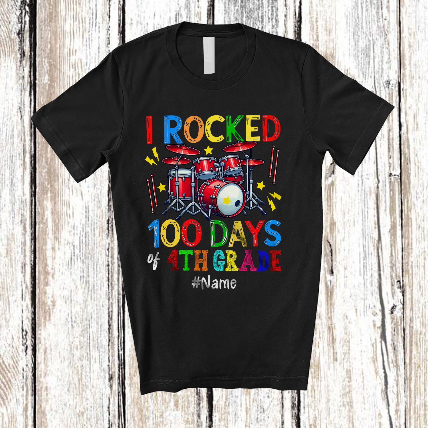 • Personalized I Rocked 100th Day of 4th Grade; Amusing School Drum; Custom Name Drummer T-Shirt. This cotton t-shirt is a durable staple product with a classic fit. One of the most popular items, it has a relaxed style made for everyday and casual wear.