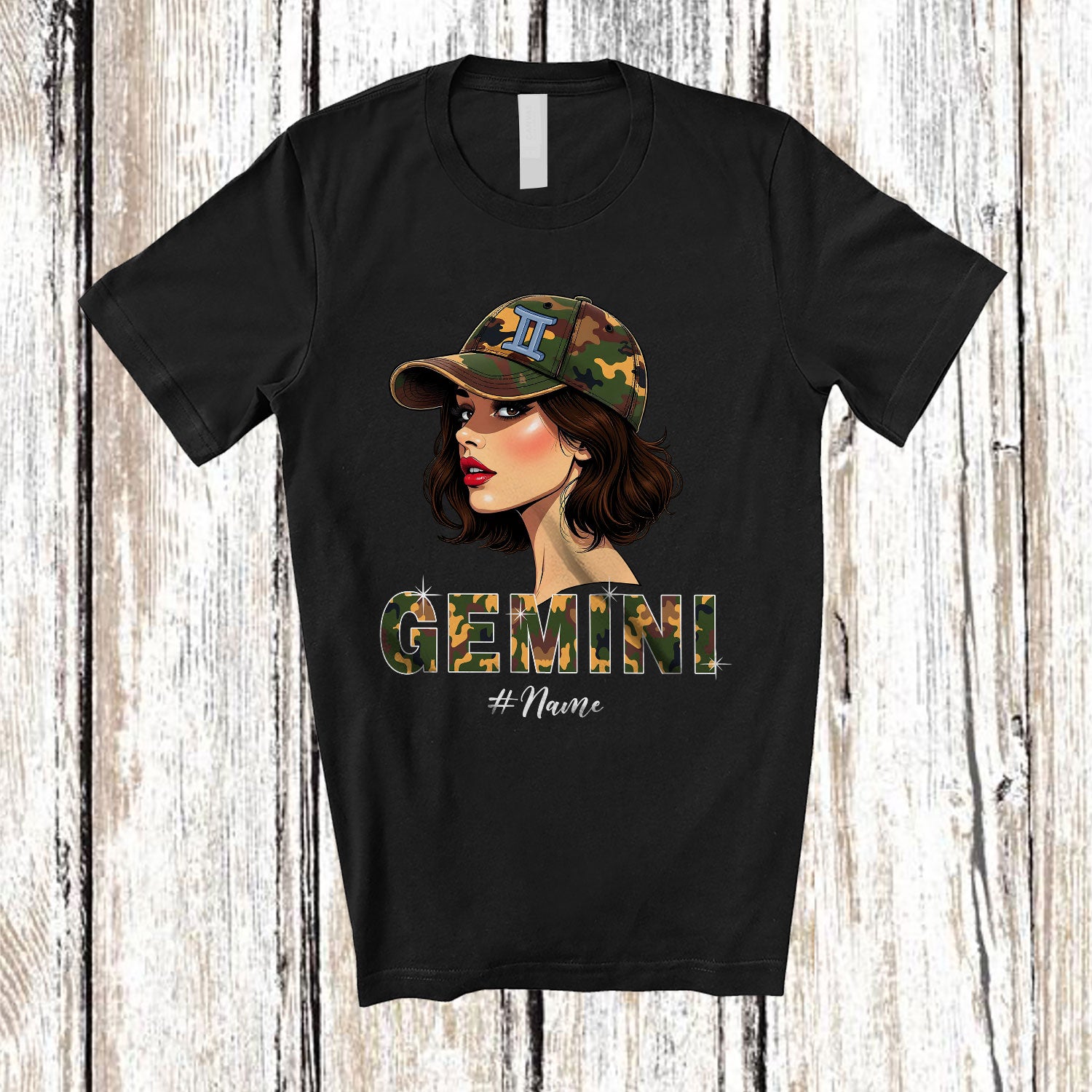 • Personalized Custom Name Gemini; Amusing Birthday Camouflage Custom Name Women; Zodiac Sign T-Shirt. This cotton t-shirt is a durable staple product with a classic fit. One of the most popular items, it has a relaxed style made for everyday and casual wear.