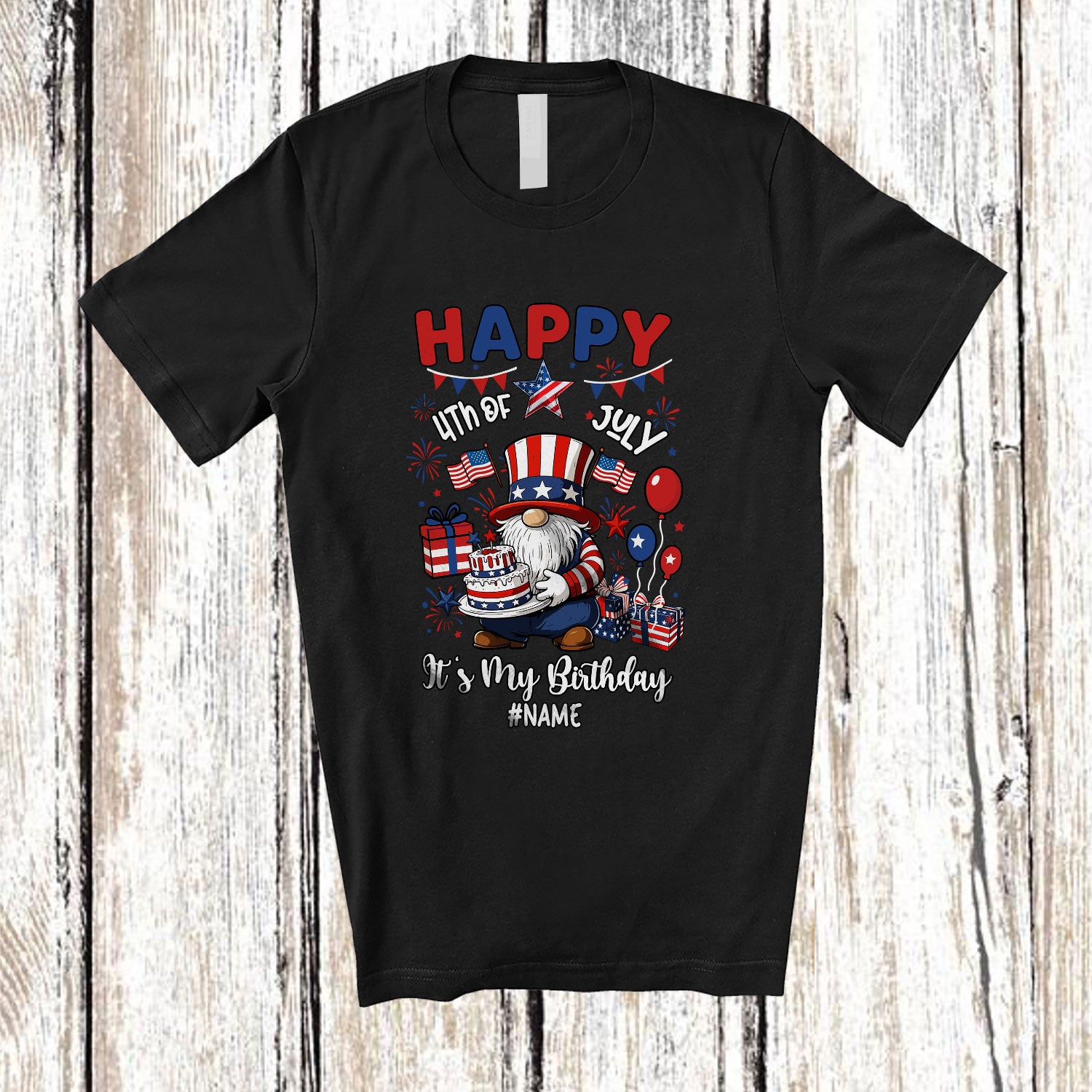 Personalized Custom Name Happy 4th of July My Birthday; Joyful Gnome Birthday Cake Patriotic T-Shirt. This cotton t-shirt is a durable staple product with a classic fit. One of the most popular items, it has a relaxed style made for everyday and casual wear.