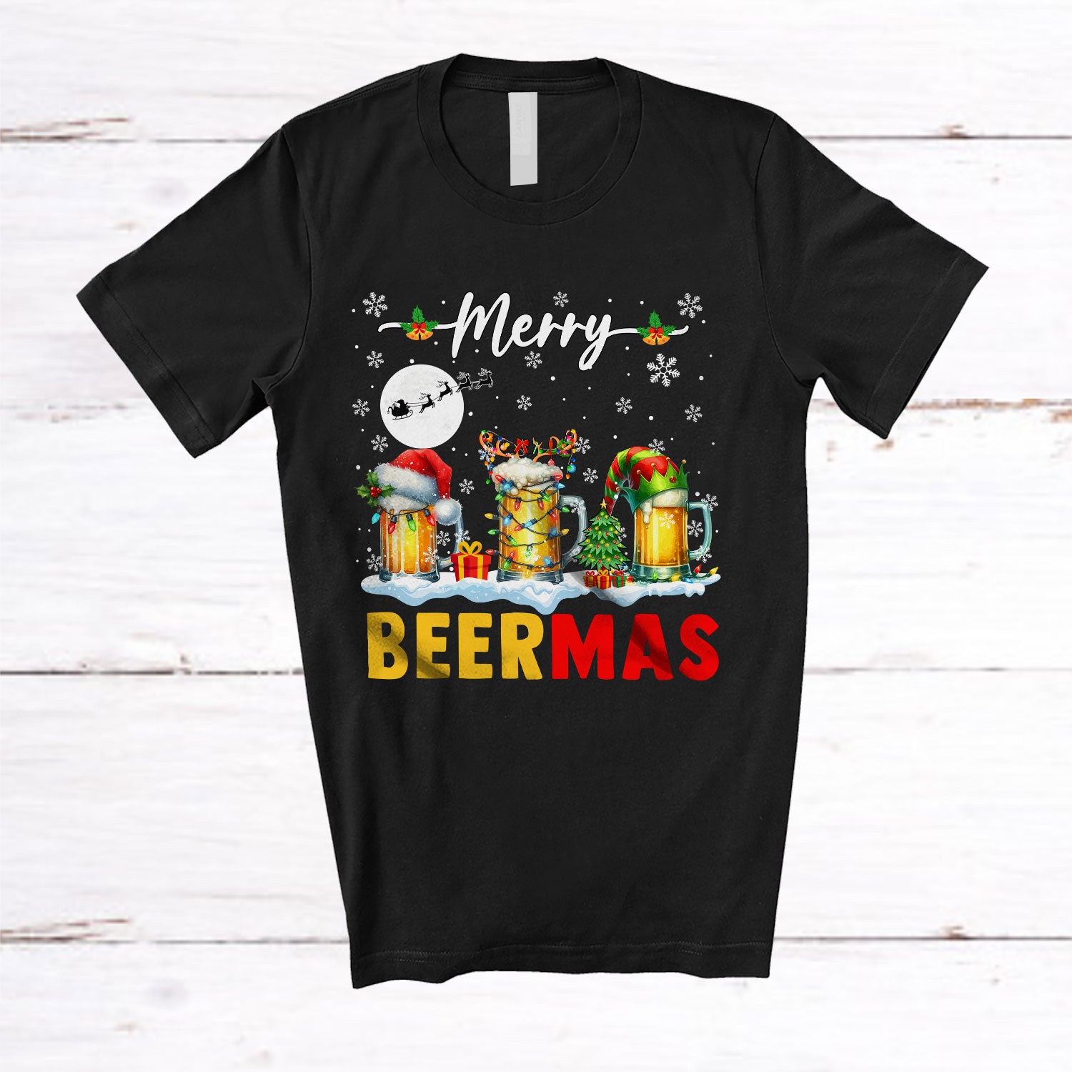 Merry Beermas; Joyful Christmas Lights Snowing Beer; X-mas Moon Drinking Drunker T-Shirt. This cotton t-shirt is a durable staple product with a classic fit. One of the most popular items, it has a relaxed style made for everyday and casual wear.
