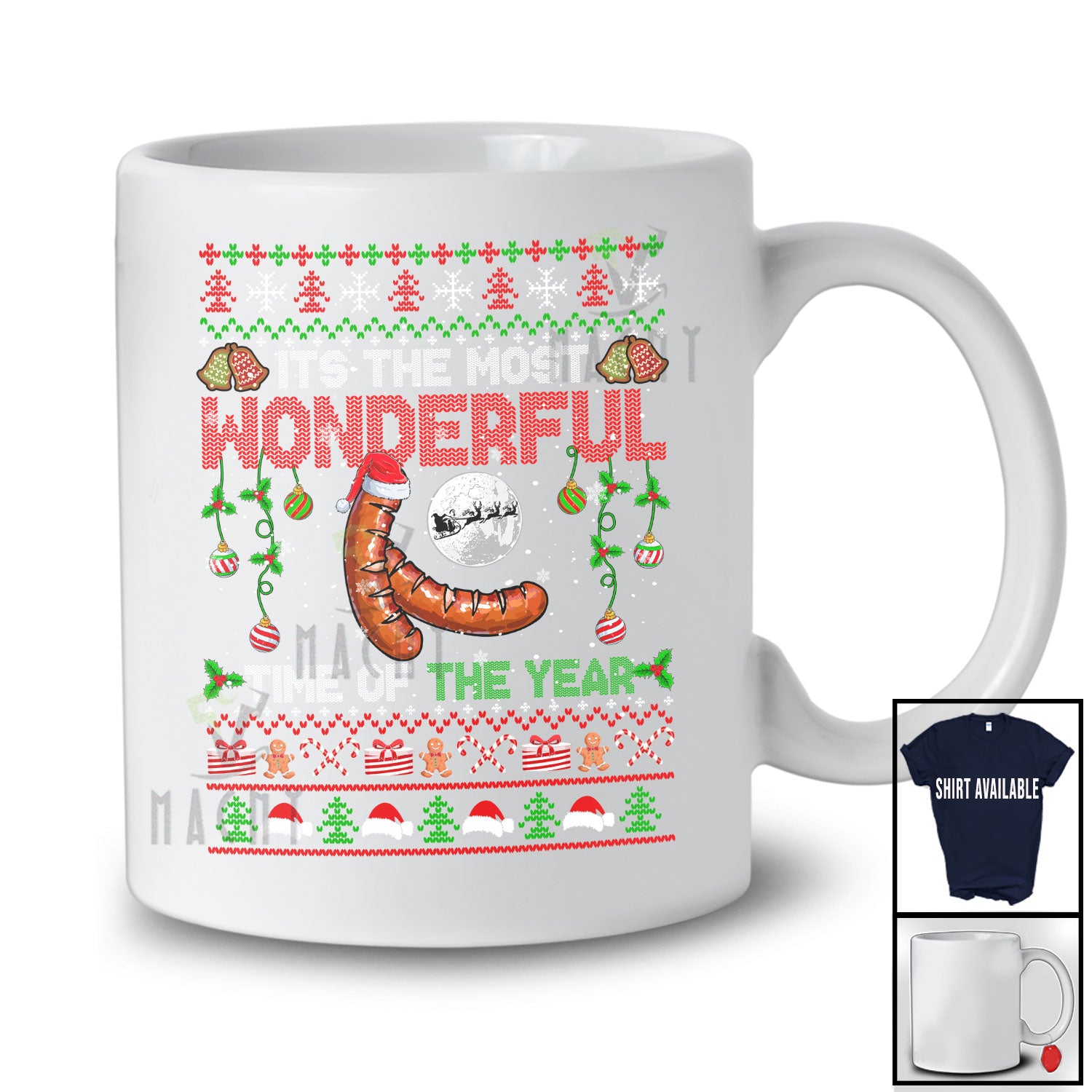 • Most Wonderful Time Of The Year; Amusing Christmas Sweater Santa Sausage; Food Family T-Shirt. This cotton t-shirt is a durable staple product with a classic fit. One of the most popular items, it has a relaxed style made for everyday and casual wear.
