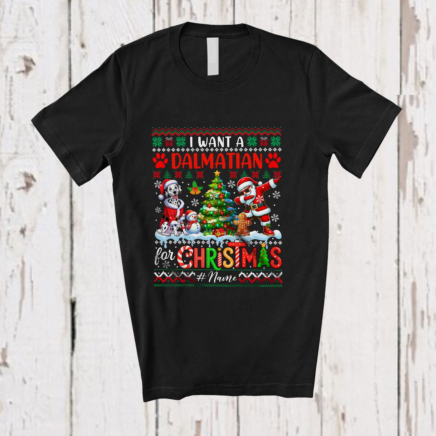 Personalized Custom Name I Want A Dalmatian For Christmas; Cheerful Sweater Dabbing Santa T-Shirt. This cotton t-shirt is a durable staple product with a classic fit. One of the most popular items, it has a relaxed style made for everyday and casual wear.