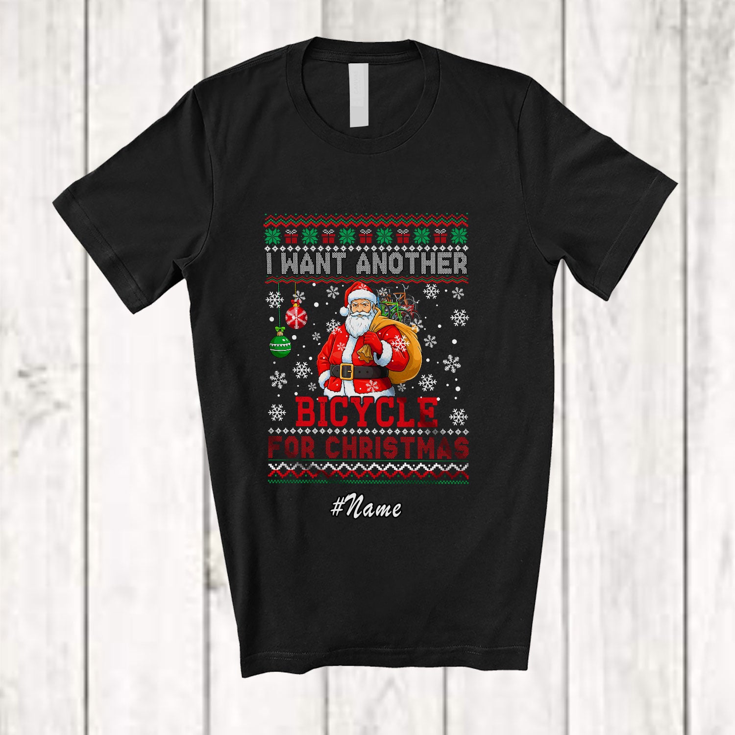 • Personalized Custom Name I Want Another Bicycle Christmas; Humorous Sweater Santa Rider T-Shirt. This cotton t-shirt is a durable staple product with a classic fit. One of the most popular items, it has a relaxed style made for everyday and casual wear.