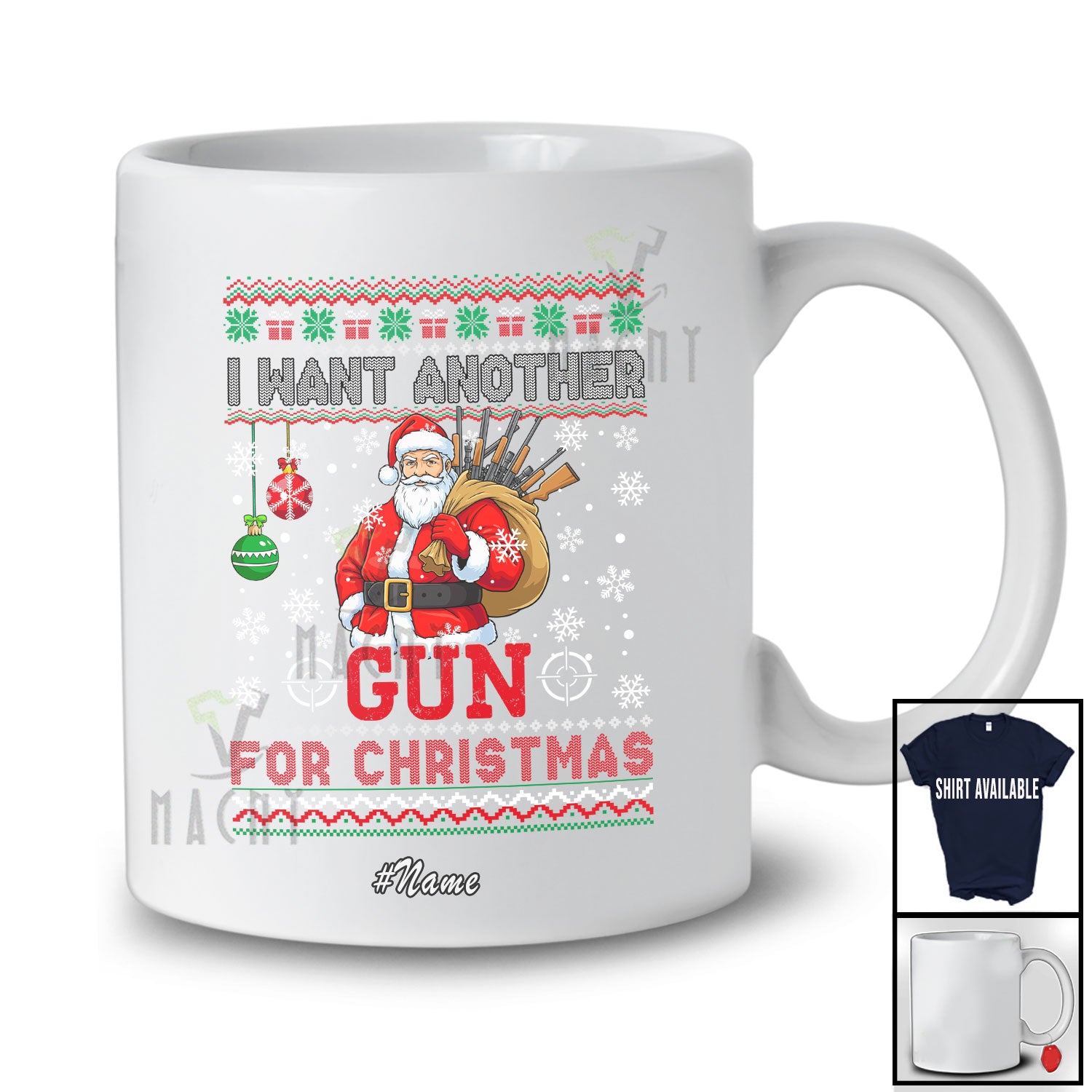 Personalized Custom Name I Want Another Gun Christmas; Humorous Sweater Santa Hunting Hunter T-Shirt. This cotton t-shirt is a durable staple product with a classic fit. One of the most popular items, it has a relaxed style made for everyday and casual wear.