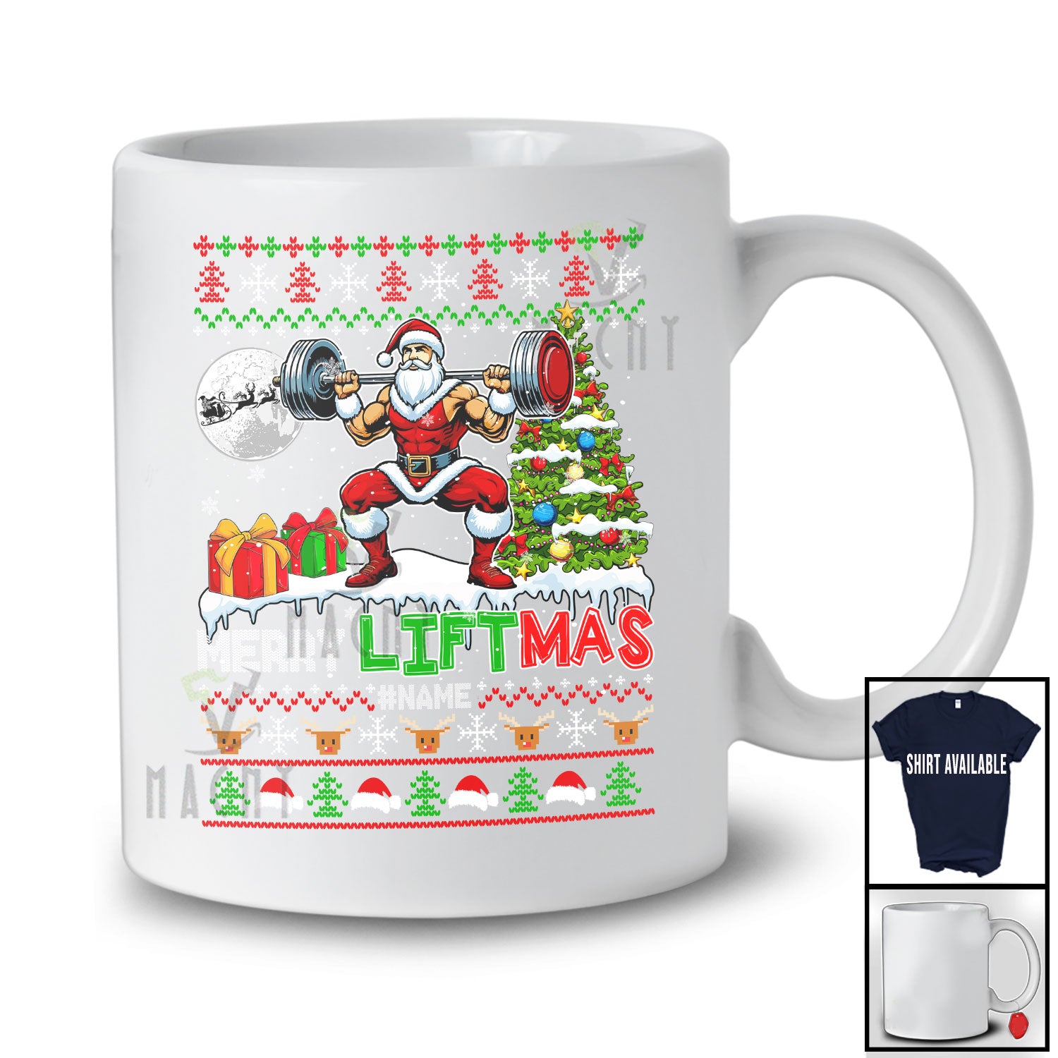 Personalized Custom Name Liftmas; Merry Christmas Muscle Santa Weightlifting; Sweater Workout T-Shirt. This cotton t-shirt is a durable staple product with a classic fit. One of the most popular items, it has a relaxed style made for everyday and casual wear.