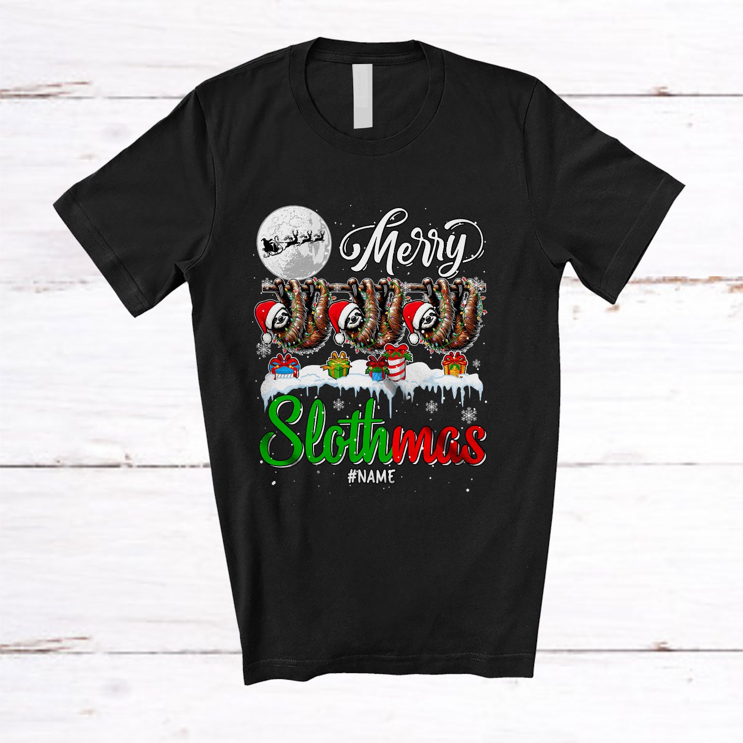 Personalized Custom Name Merry Slothmas; Amazing Christmas Three Santa Sloth; Snow Animal T-Shirt. This cotton t-shirt is a durable staple product with a classic fit. One of the most popular items, it has a relaxed style made for everyday and casual wear.