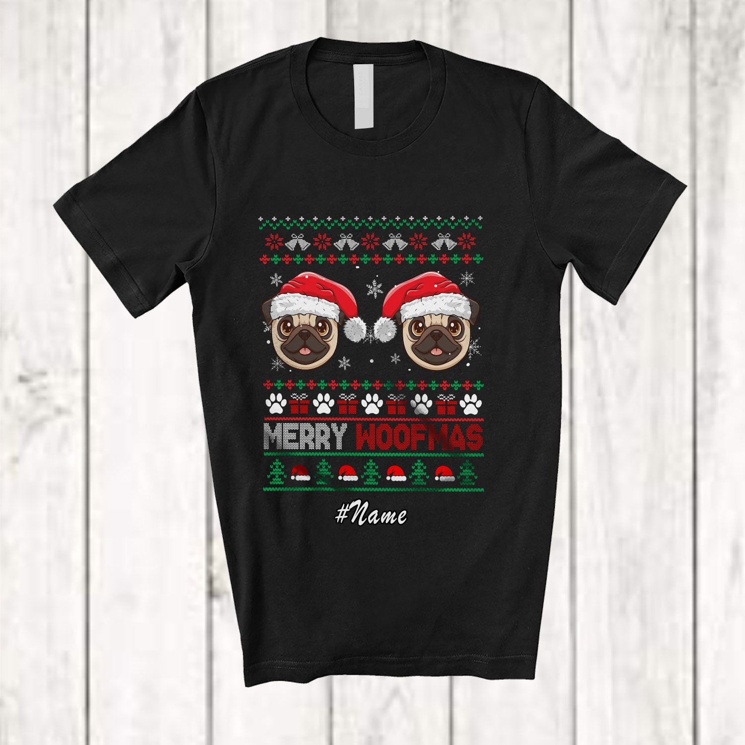 • Personalized Custom Name Merry Woofmas; Lovely Christmas Sweater Santa Pug Face Owner T-Shirt. This cotton t-shirt is a durable staple product with a classic fit. One of the most popular items, it has a relaxed style made for everyday and casual wear.