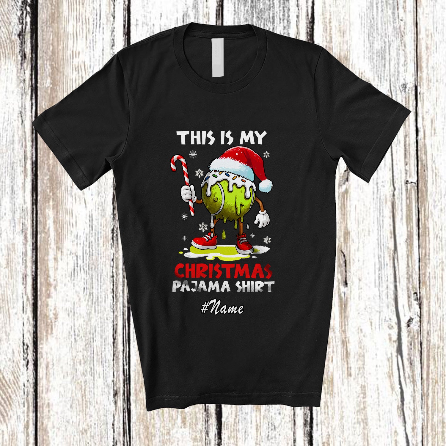 • Personalized Custom Name My Christmas Pajama Shirt; Lovely Melting Santa Tennis Player T-Shirt. This cotton t-shirt is a durable staple product with a classic fit. One of the most popular items, it has a relaxed style made for everyday and casual wear.