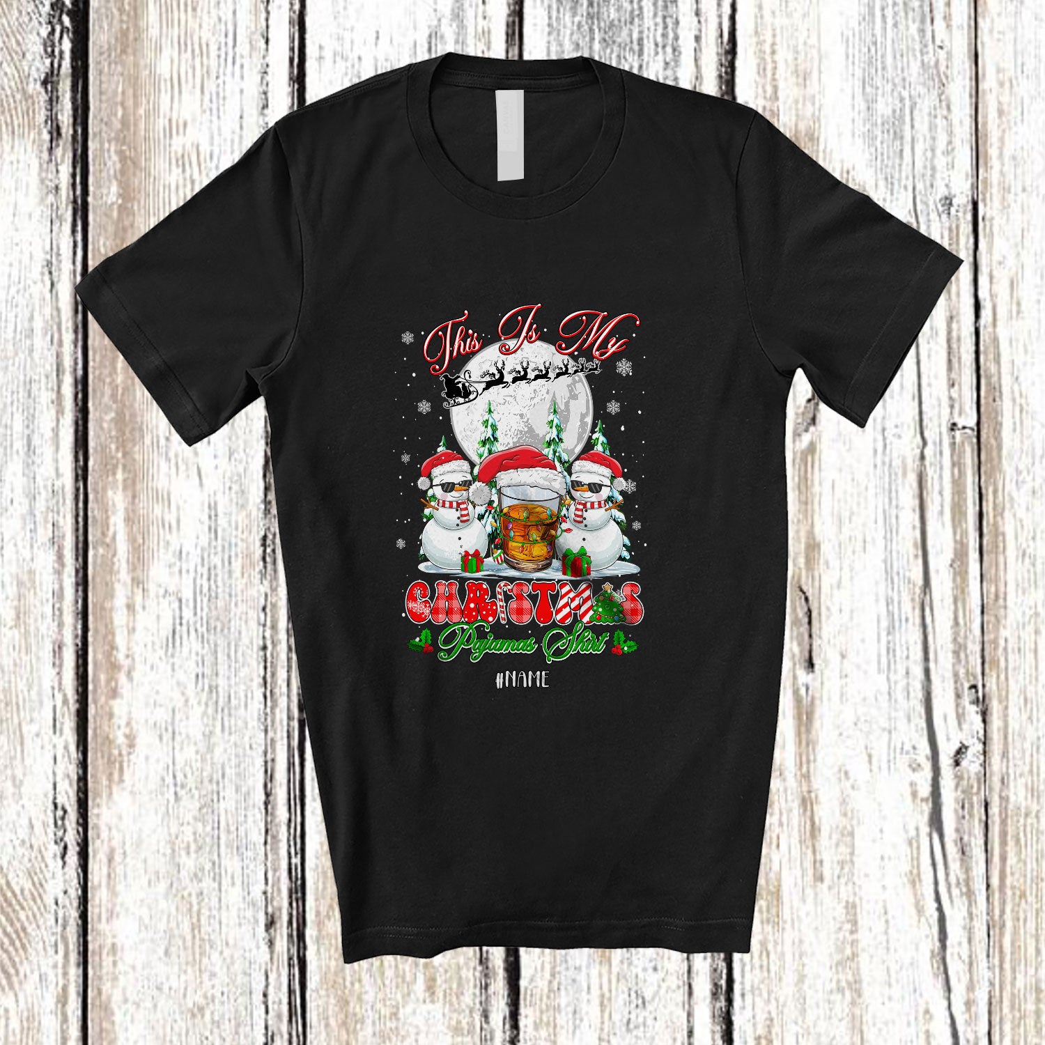 Personalized Custom Name My Christmas Pajamas Shirt; Joyful Santa Snowman Bourbon; Drinking T-Shirt. This cotton t-shirt is a durable staple product with a classic fit. One of the most popular items, it has a relaxed style made for everyday and casual wear.