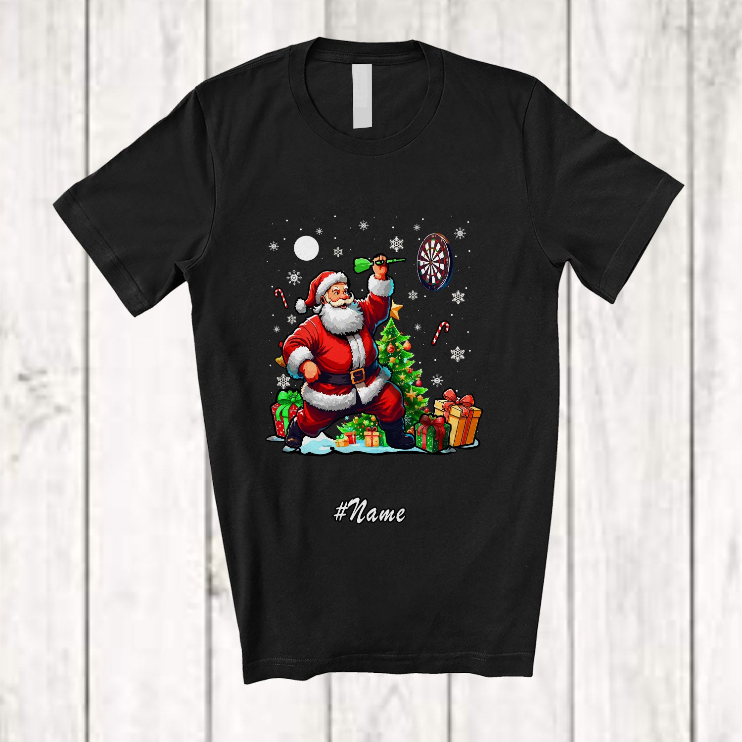 • Personalized Custom Name Santa Playing Darts; Amazing Christmas Tree Snow Darts Player T-Shirt. This cotton t-shirt is a durable staple product with a classic fit. One of the most popular items, it has a relaxed style made for everyday and casual wear.