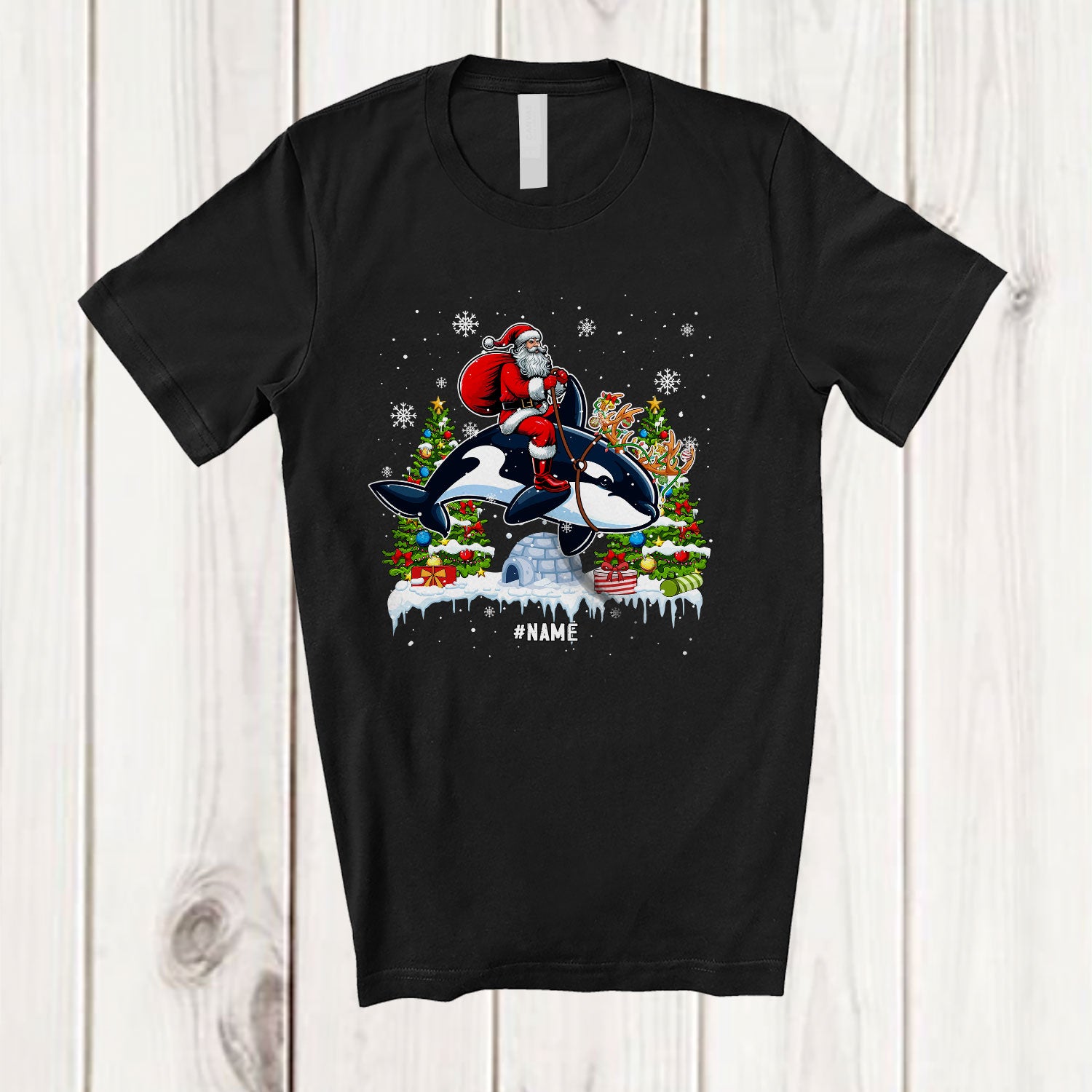 Personalized Custom Name Santa Riding Orca Reindeer; Humorous Christmas Lights Sea Animal T-Shirt