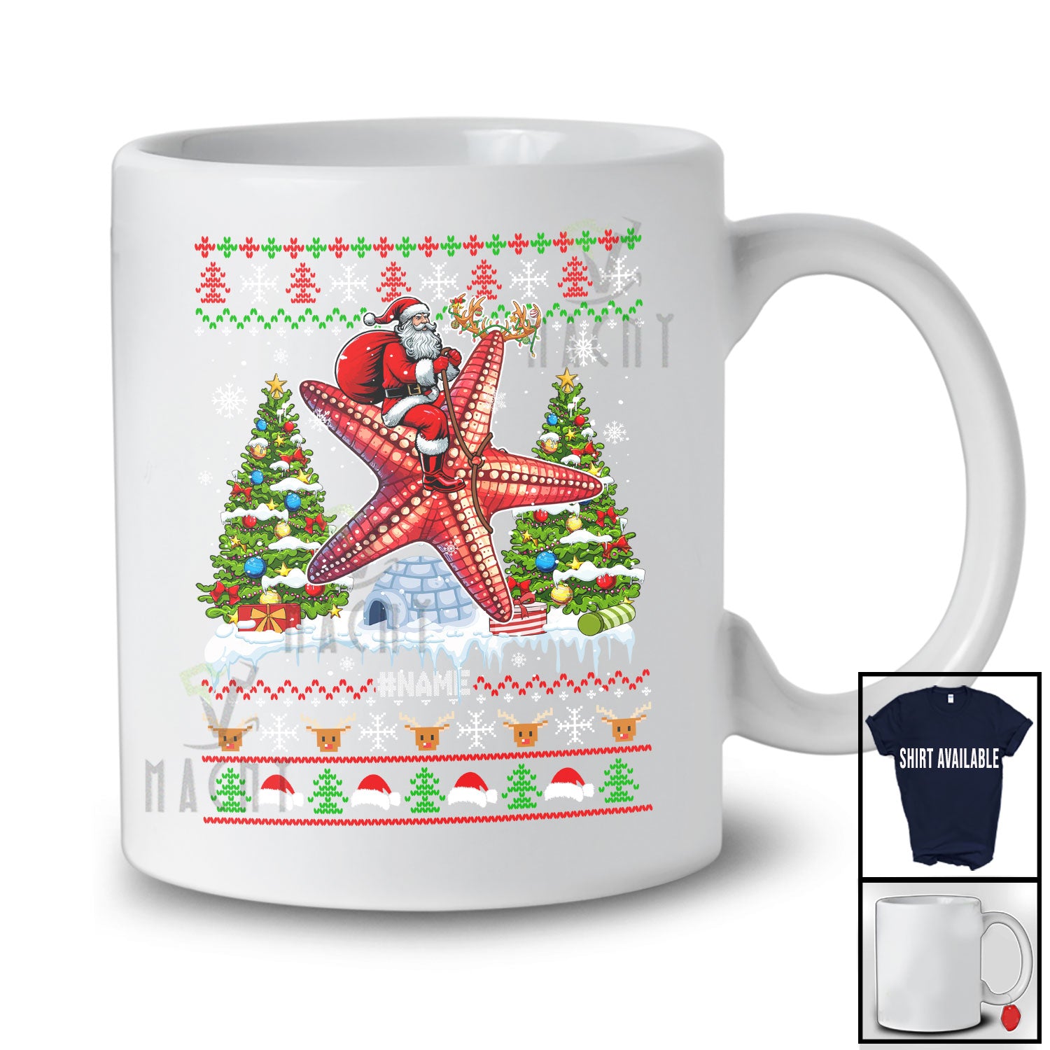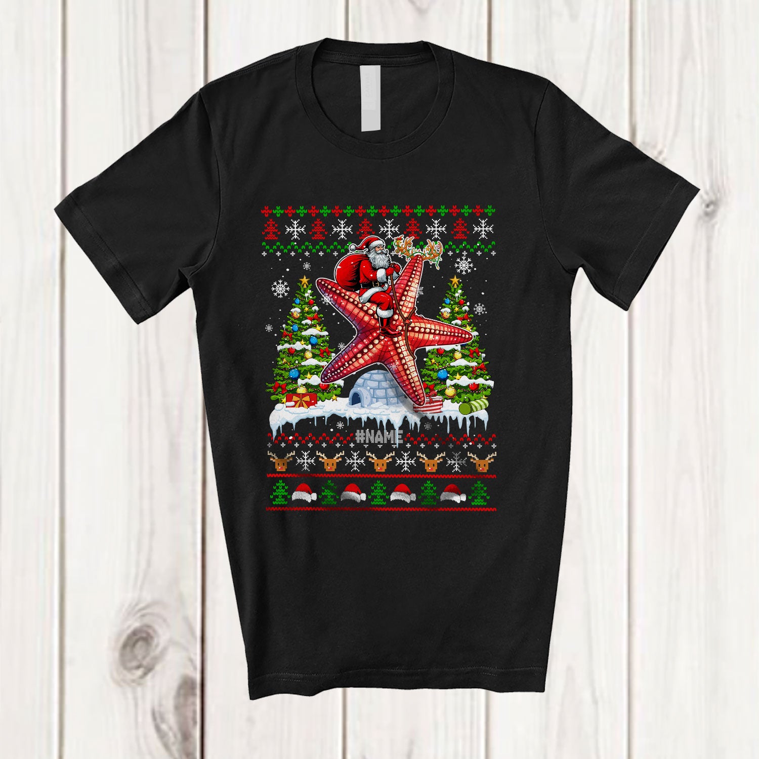 Personalized Custom Name Santa Riding Starfish Reindeer; Humorous Christmas Sweater Sea Animal T-Shirt