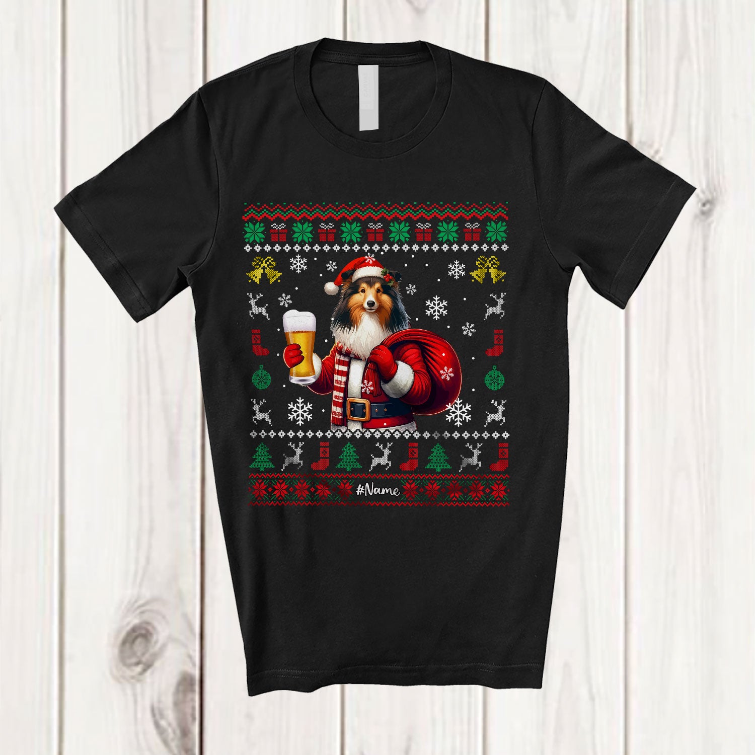 Personalized Custom Name Santa Shelties Drinking Beer; Fantastic Christmas Sweater Drunker T-Shirt. This cotton t-shirt is a durable staple product with a classic fit. One of the most popular items, it has a relaxed style made for everyday and casual wear.