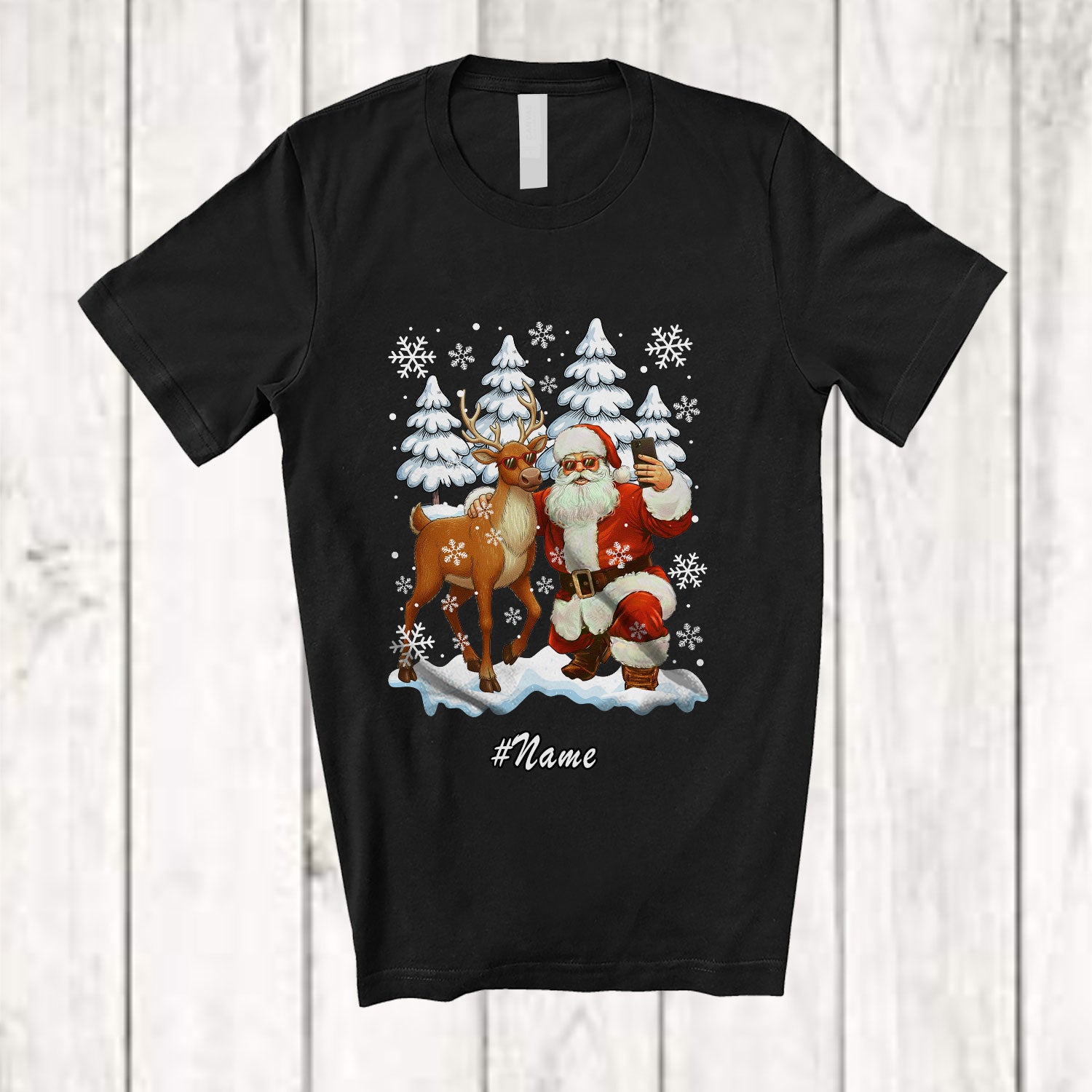 • Personalized Custom Name Santa With Reindeer Selfie; Lovely Christmas Snow Trees Believe Santa T-Shirt. This cotton t-shirt is a durable staple product with a classic fit. One of the most popular items, it has a relaxed style made for everyday and casual wear.