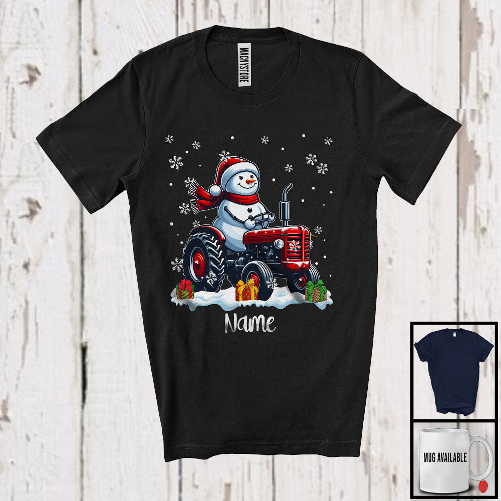 Personalized Custom Name Snowman Driving Tractor, Adorable Christmas Rider, X-mas Team T-Shirt