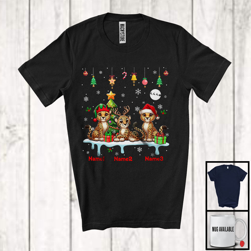 Personalized Custom Name Three Elf Santa Cheetah Snowing; Joyful Christmas Tree Animal T-Shirt