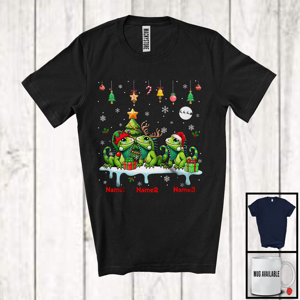 Personalized Custom Name Three Elf Santa Iguana Snowing; Joyful Christmas Tree Animal T-Shirt