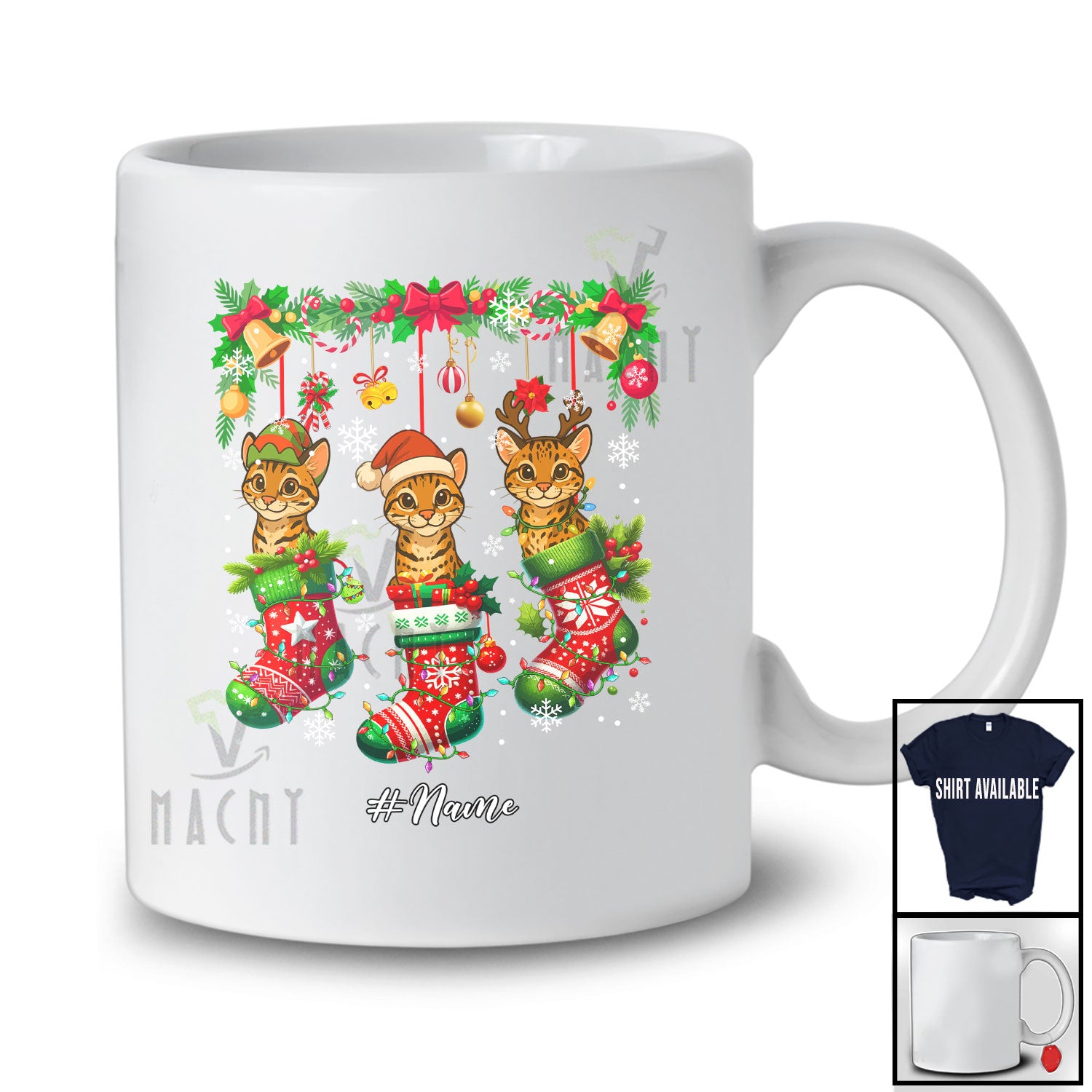 Personalized Custom Name Three Ocelot In Christmas Socks; Amusing X-mas Lights Animal Lover T-Shirt. This cotton t-shirt is a durable staple product with a classic fit. One of the most popular items, it has a relaxed style made for everyday and casual wear.