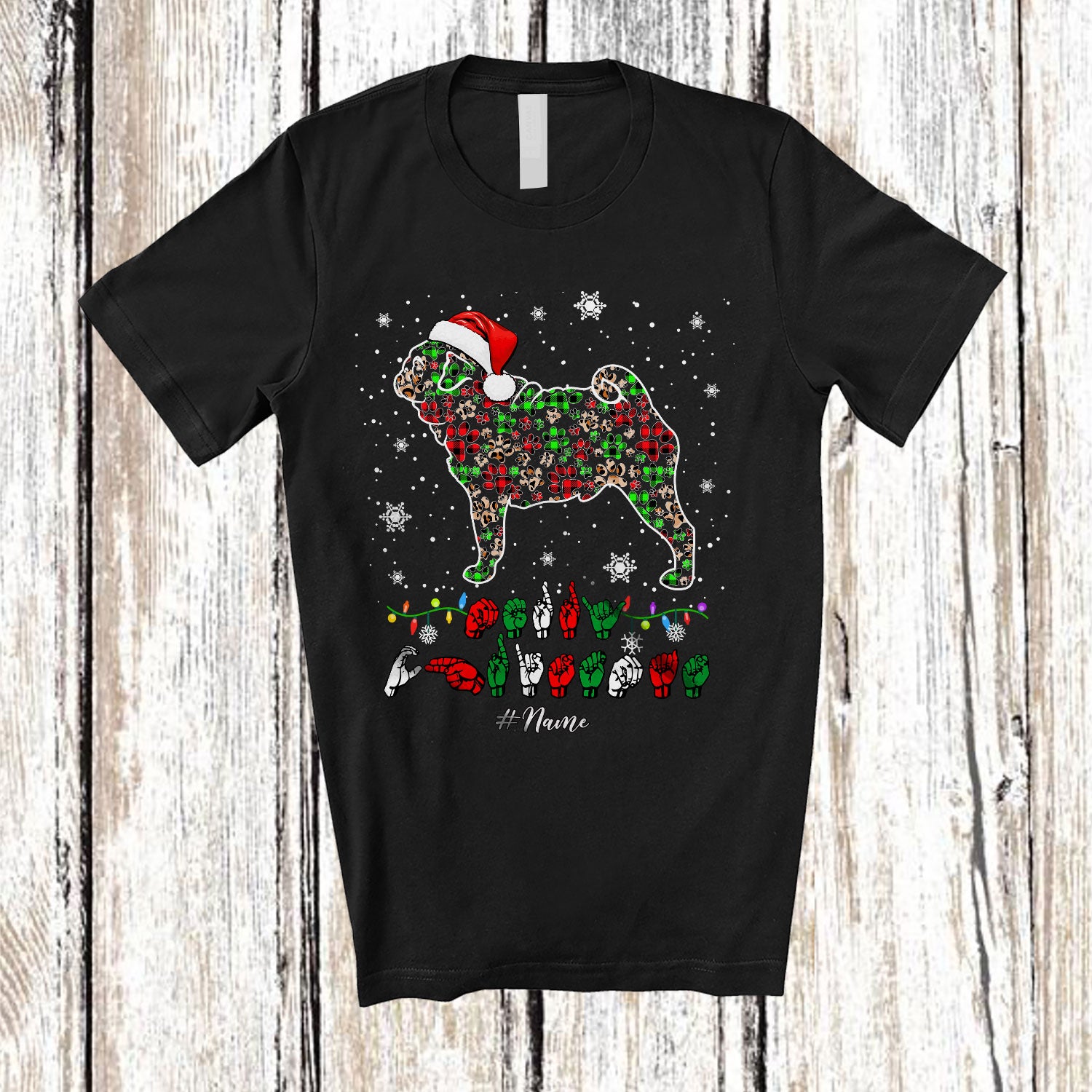 Personalized Merry Christmas ASL; Lovely Custom Name Santa Pug Paws Shape; Sign Language T-Shirt