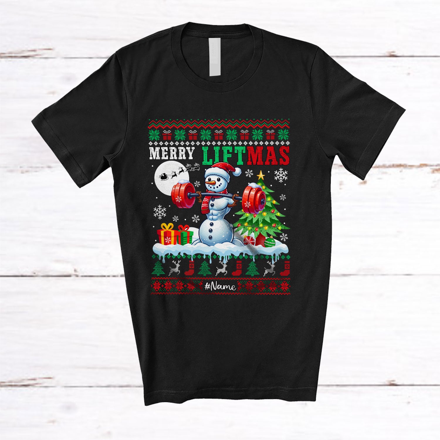 Personalized Merry Liftmas; Amusing Christmas Sweater Custom Name Muscle Snowman; Weightlifting T-Shirt
