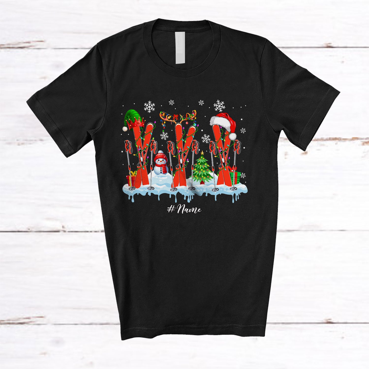• Personalized Three Elf Santa Reindeer Skiing; Fantastic Christmas Custom Name Skiing Player T-Shirt. This cotton t-shirt is a durable staple product with a classic fit. One of the most popular items, it has a relaxed style made for everyday and casual wear.